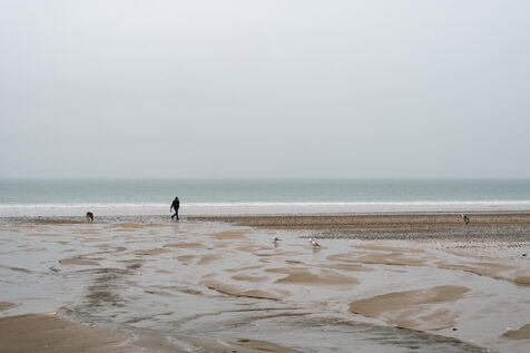 There's a very special atmosphere on Plérin's plage des rosaires, where seagulls and gulls flutter about, while a few walkers with their dogs brave the rain and pretend nothing's happening.
