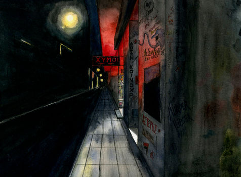 Central area of Exarcheia, Athens, during the lockdown. I wanted to work in painting on the fascinating lights of Exarcheia.