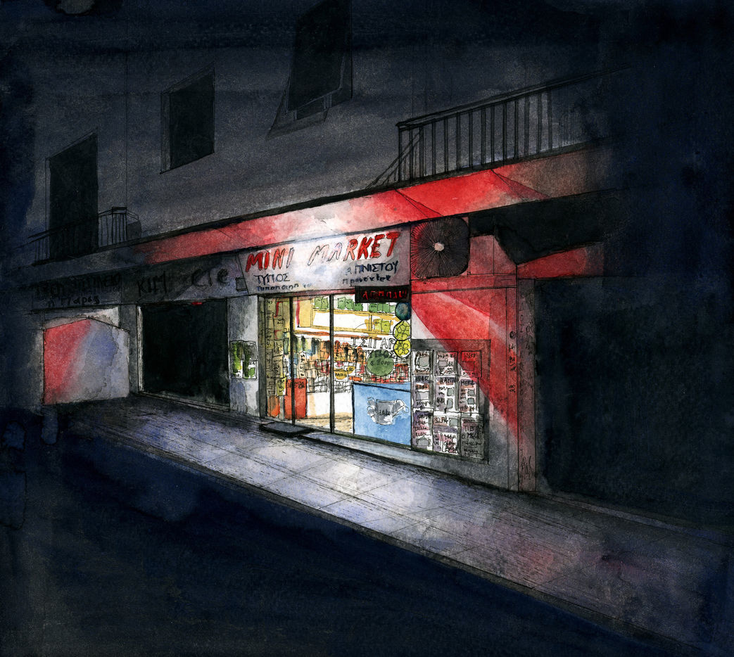Le deuxième confinement lié à l'augmentation de la diffusion du Covid-19 a démarré le 7 novembre. Exarcheia, quartier central d'Athènes réputé anarchiste, d'ordinaire animé, s'est endormi. J'ai voulu réaliser un travail sur ses ombres et lumières fascinantes. Des néons, des enseignes rouges, des lampadaires aux halos faibles qui éclairent les colonnes des galeries, les édifices à l'architecture anarchique. Des nuances précieuses dans la nuit noire et aujourd'hui silencieuse de ce quartier peu éclairé.