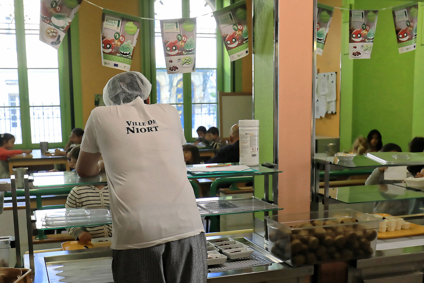 Des élèves d'une école primaire de Niort, dans les Deux-Sèvres déjeunent à la cantine. Ils choisissent leur plat, mangent et enfin trient les déchets avant de déposer leurs couverts.