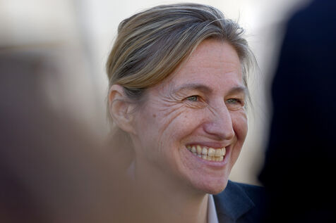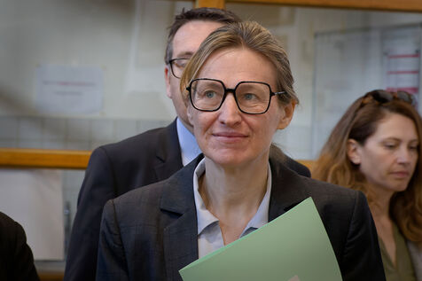 Astrid Panosyan-Bouvet, la Ministre chargée du Travail et de l'Emploi est venue en Charente, a Sireuil, France pour visiter une distillerie de cognac et discuter avec les acteurs de la filière tourmentée par la situation internationale dont les droits de douane.