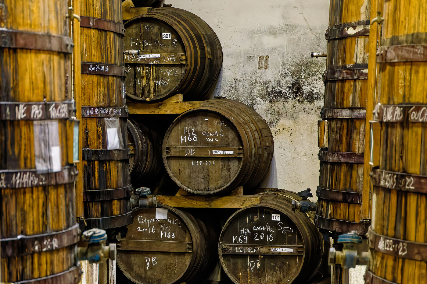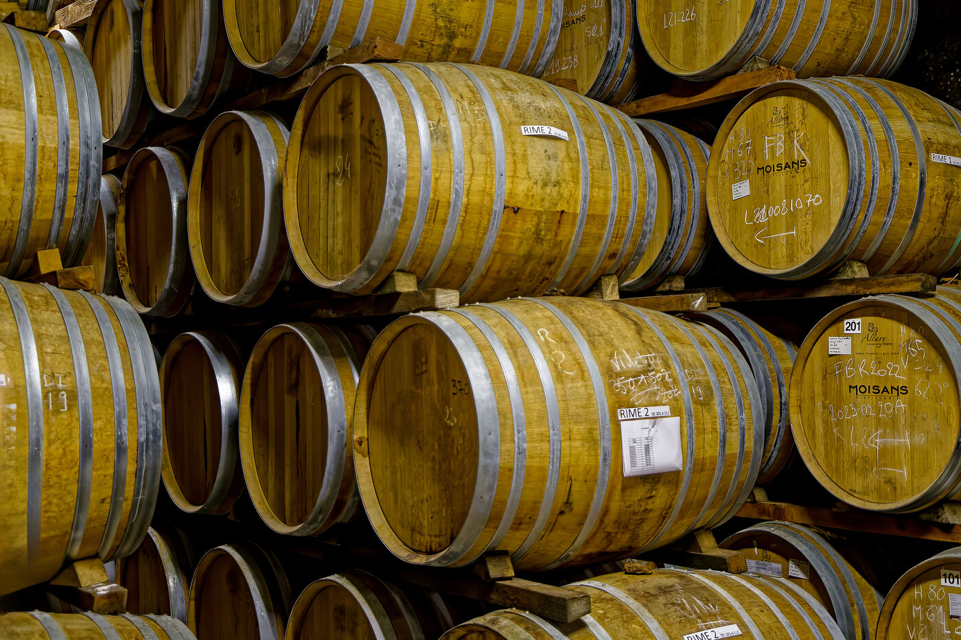 Visite des chais et de la boutique de la distillerie des Moisans qui commercialise la marque de Cognac et de Pineau des Charentes Deau. Cuves, barriques de vieillissement, bouteilles de Cognac...