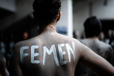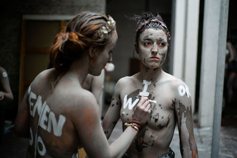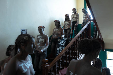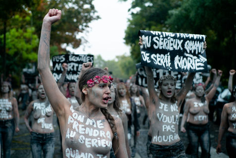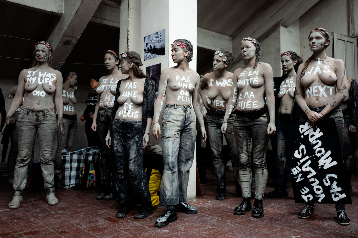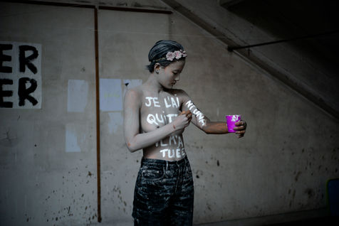 In white acrylic they wear among other things "I didn't want to die" "I left him, he killed me". Inna Shevchenko, a historical member of the Femen, gave specific training in non-violent activism (how to place yourself, hold your sign, respond to the police) for the new recruits who came in large numbers for this action.