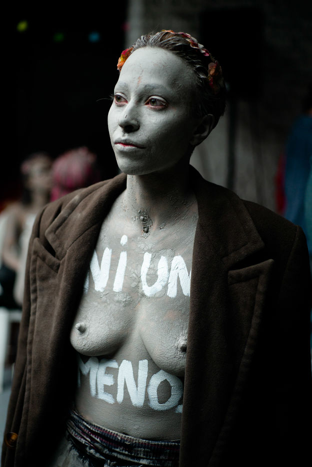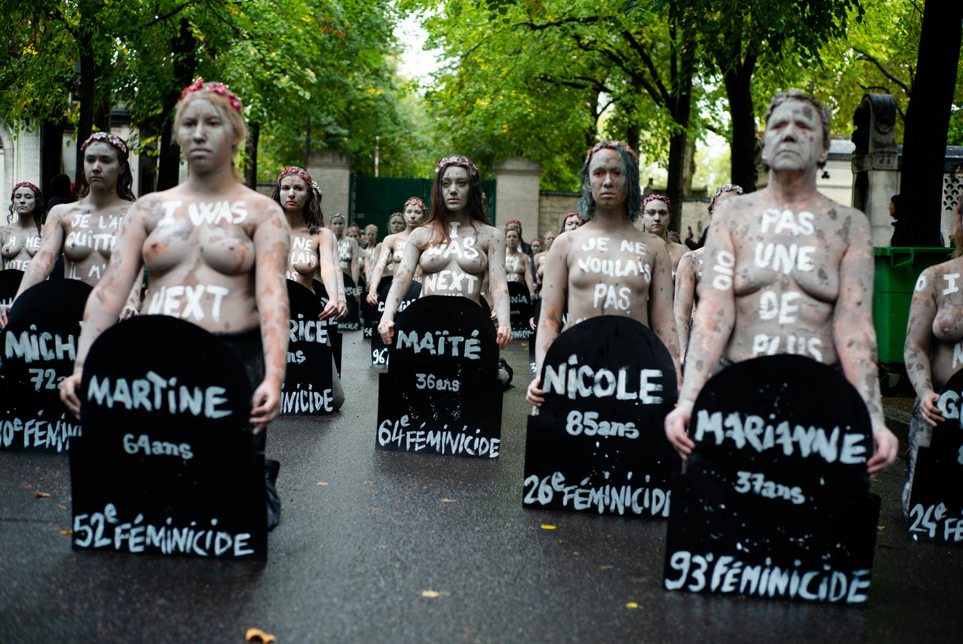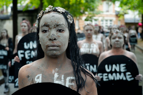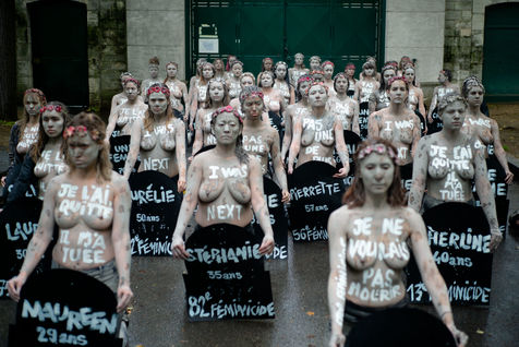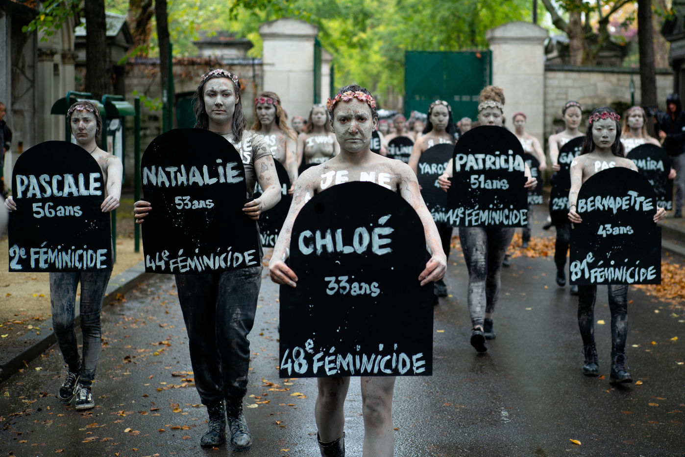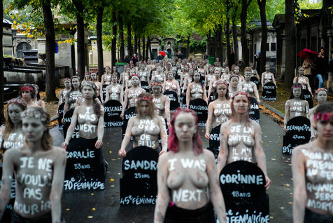 Les Femen ont défilé du boulevard Saint-Jacques jusqu'au cimetière du Montparnasse. Recouverte d'argile, pour ressembler aux femmes mortes sous les coups de leurs conjoints qui reviendraient hanter les mémoires d'une société trop passive et d'un gouvernement aux mesures insuffisantes.