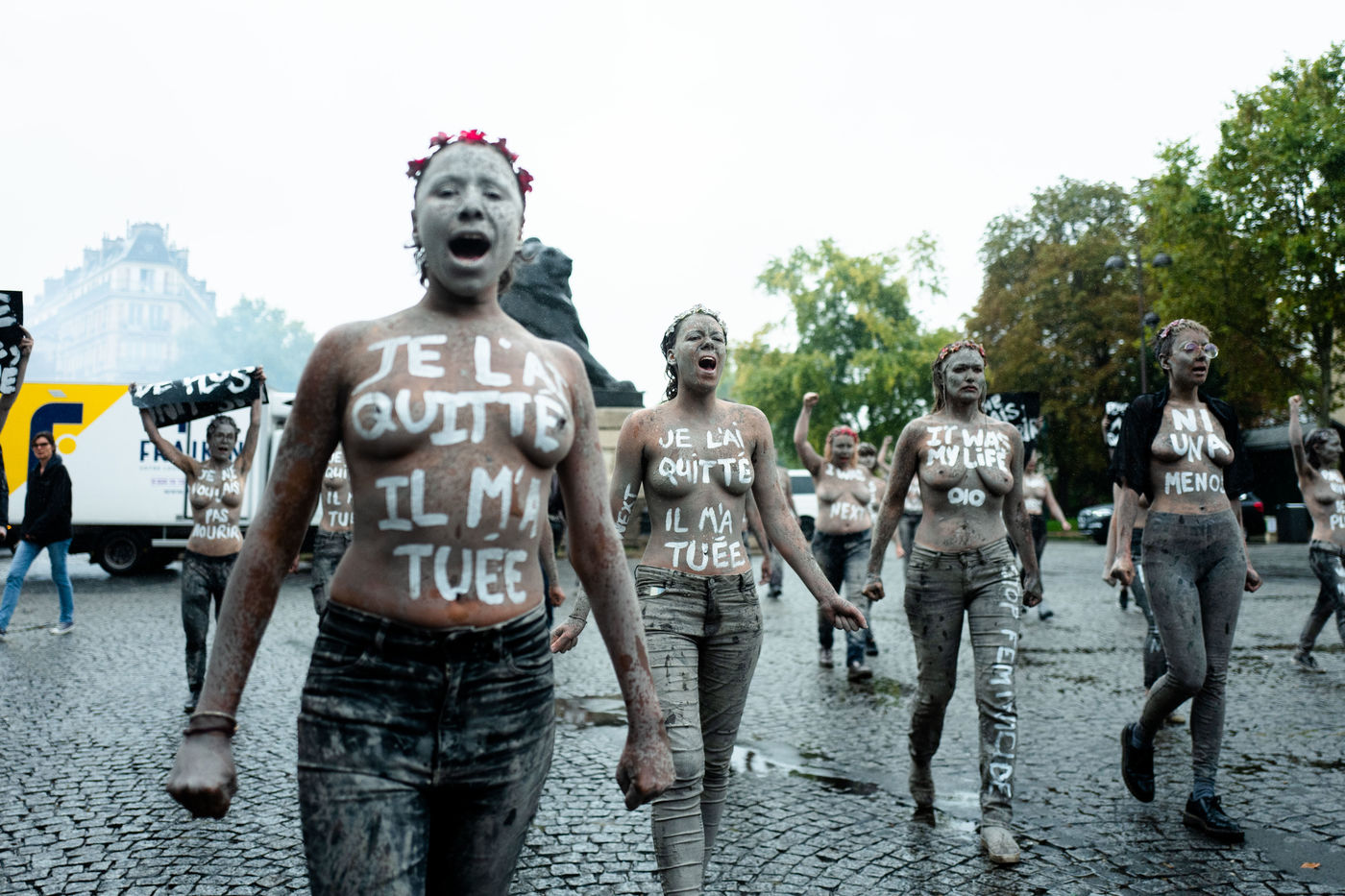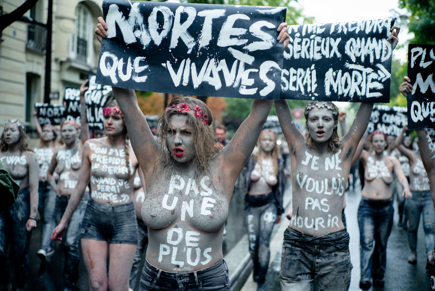 The Femen marched from Boulevard Saint-Jacques to the Montparnasse cemetery. Covered in clay, to resemble the women who died under the blows of their spouses who would come back to haunt the memories of a society that was too passive and a government with insufficient measures.