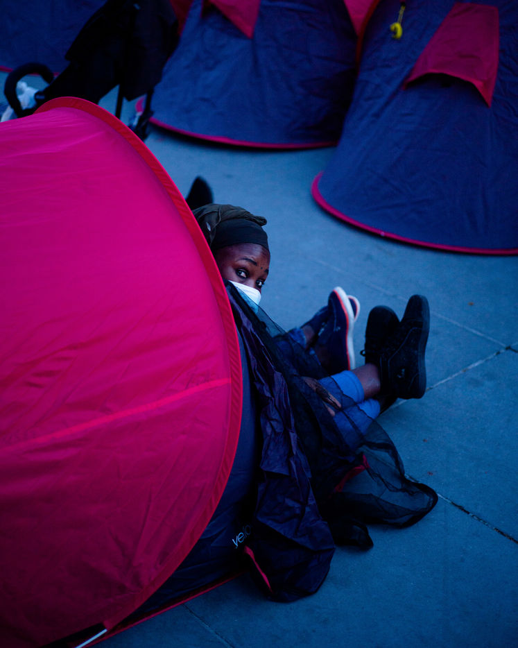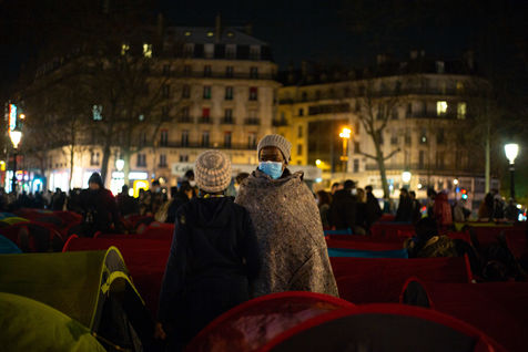 On the occasion of the night of solidarity, the Collectif Réquisition and Utopia 56 occupies the Place de la République, with more than 300 homeless women, men and children asking for their immediate accommodation. March 25, 2021, Paris (75) France. Photographie par Edouard Richard / Hans Lucas.