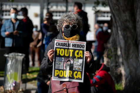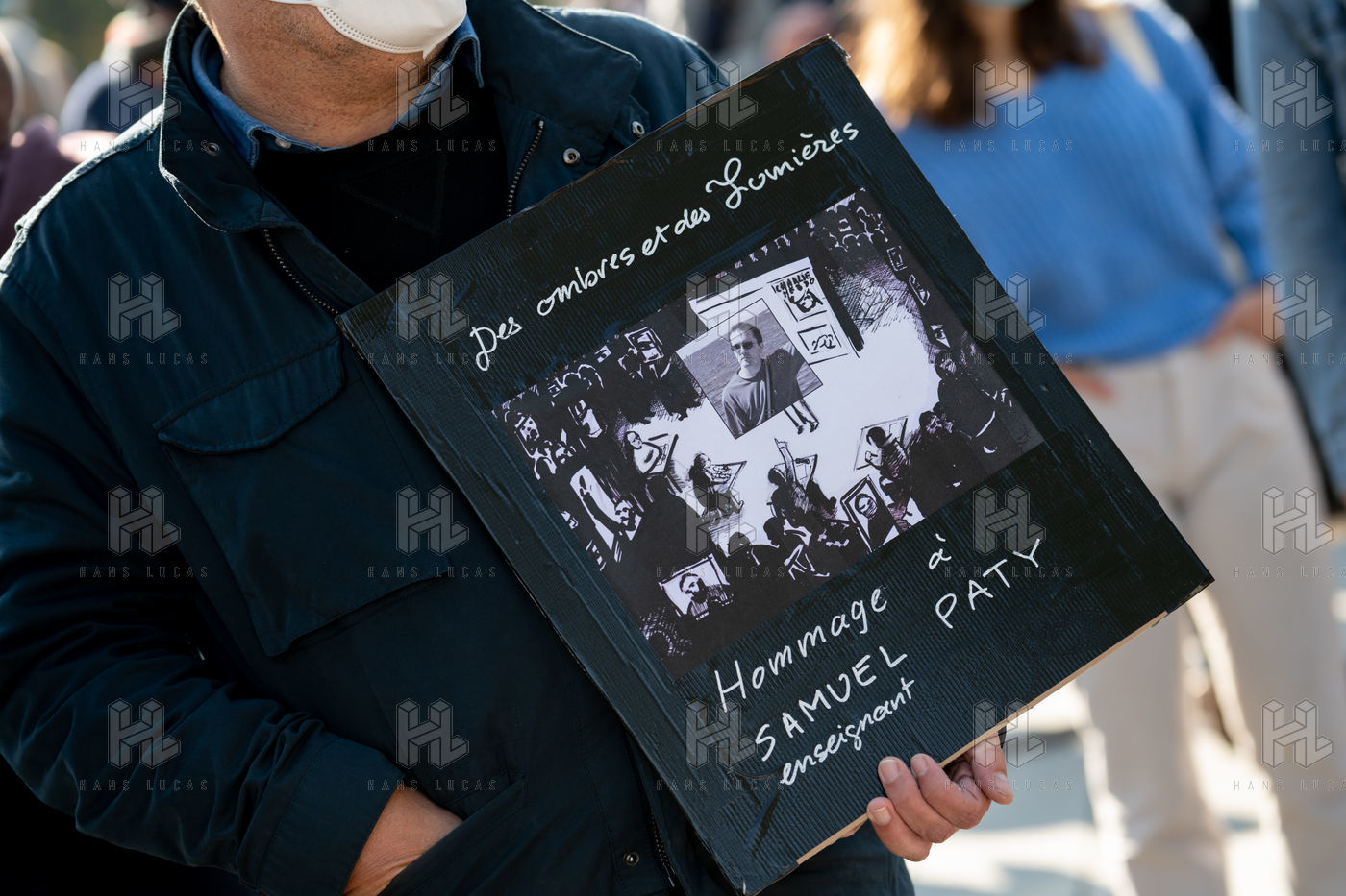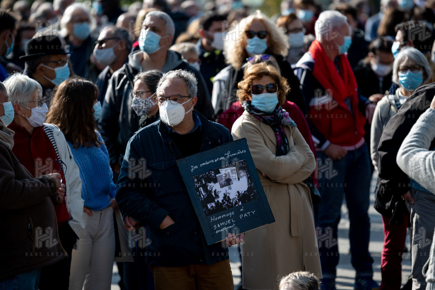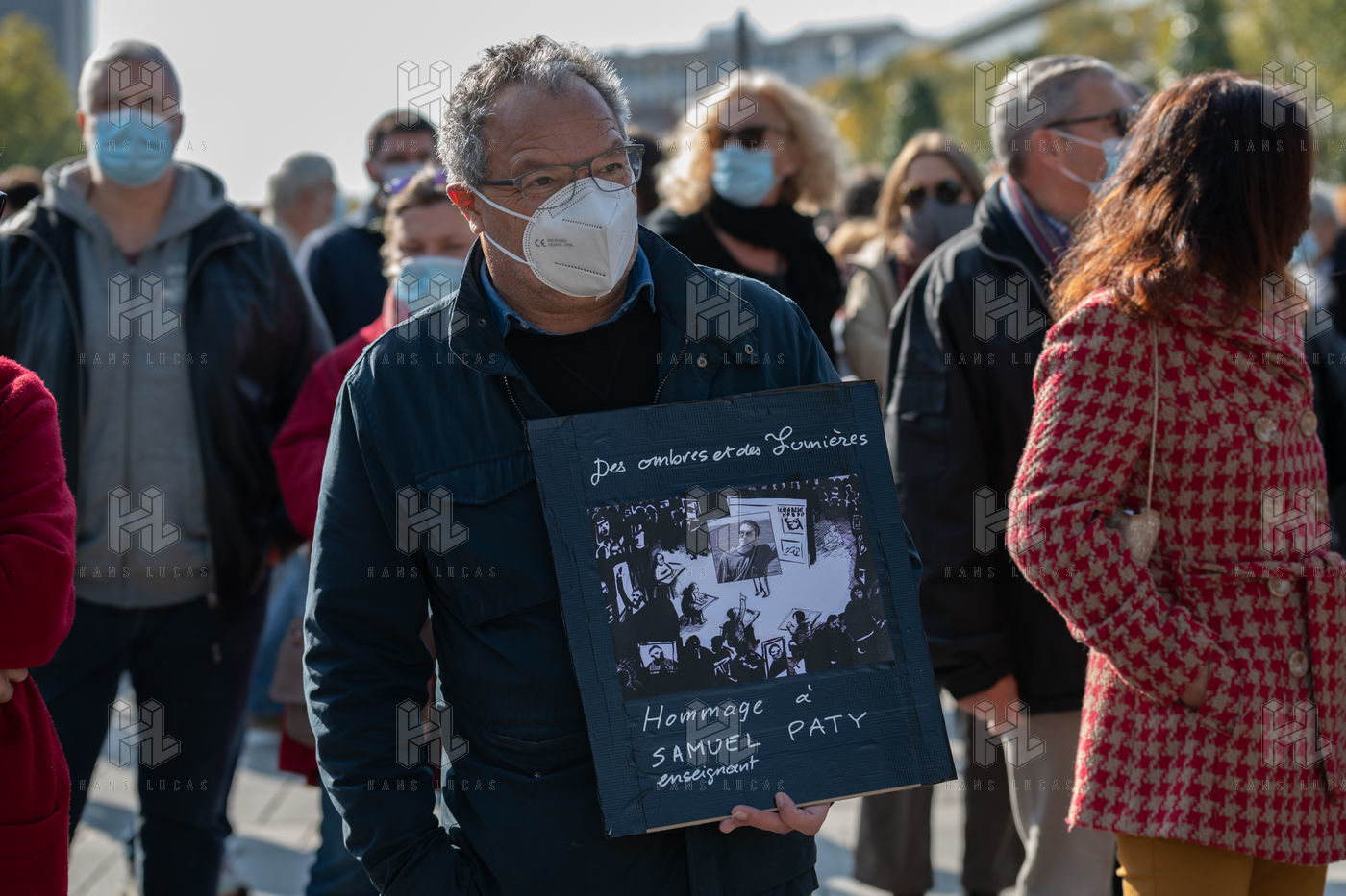 On Sunday 18 October 2020, people from Nantes gathered in Nantes to pay homage to Samuel Paty, history teacher at the College du Bois d'Aulne in Conflans-Sainte-Honorine, beheaded on 16 October 2020 by an Islamist of Chechen origin who reproached him for having shown caricatures of the Prophet Mohammed published by Charlie Hebdo to his pupils during a course on freedom of expression and the right to blasphemy. Beyond the tribute paid to the victim of this attack, this gathering initiated by trade unions whose Snes-FSU aimed to support the teaching profession, freedom of expression and to reaffirm the rejection of obscurantism.