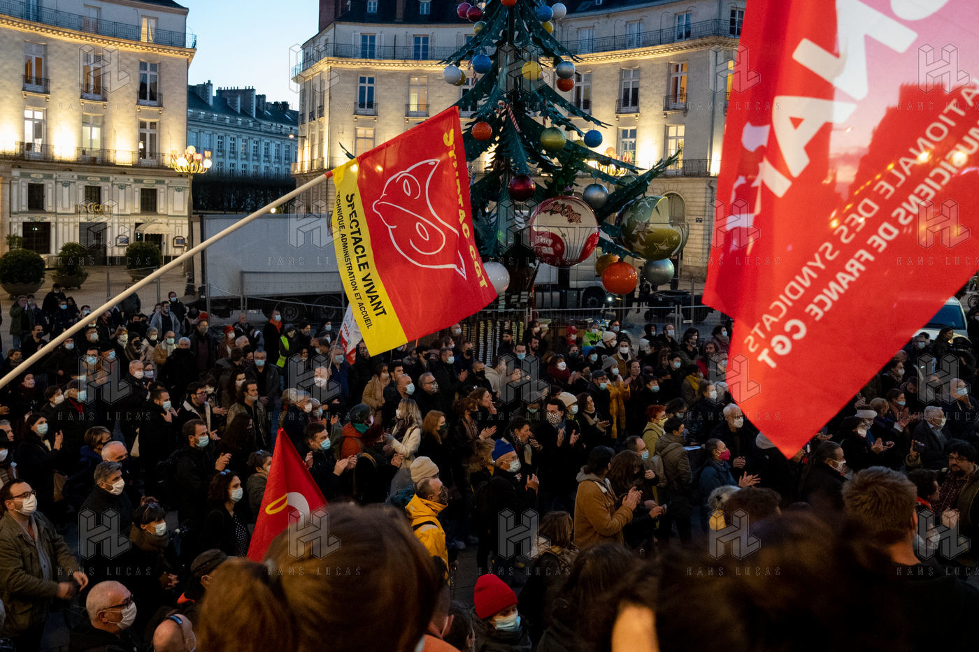 Mardi 15 décembre 2020, date officielle de sortie du deuxième confinement instauré suite à la deuxième vague épidémique de Covid-19, les acteurs du monde de la culture et du spectacle (cinémas, théâtres, musées) ont manifesté sur les marches de l?Opéra Graslin de Nantes pour protester contre la décision du gouvernement de prolonger leur fermeture au moins jusqu?au 7 janvier 2021 (annonce faite le 10 décembre par Jean Castex lors de la conférence de presse précisant les modalités du déconfinement).