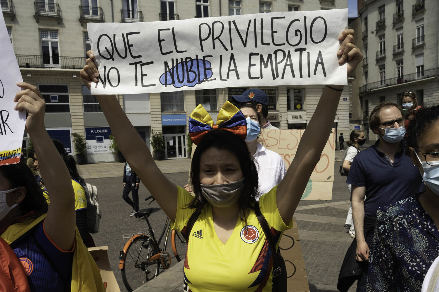 Une centaine de personnes se sont rassemblées le 8 mai 2021 à Nantes pour apporter leur soutien au peuple Colombien qui proteste depuis le 28 avril contre la réforme fiscale du gouvernement, et qui fait face à une répression sans précédent (au moins 26 morts et 800 blessés recensés entre le 28 avril et le 3 mai).