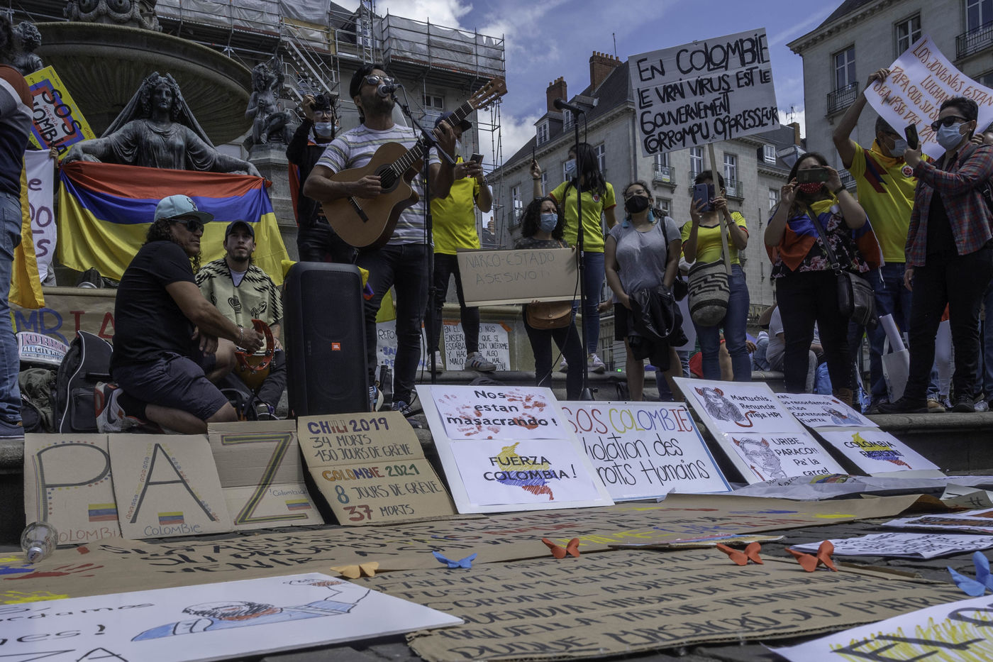 A hundred people gathered on May 8, 2021 in Nantes to support the Colombian people who have been protesting since April 28 against the government's tax reform, and who are facing an unprecedented repression (at least 26 dead and 800 injured between April 28 and May 3).