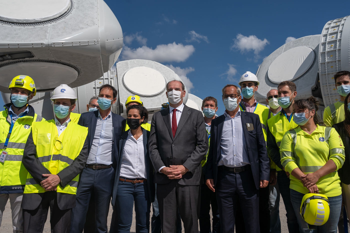 Prime Minister Jean Castex, accompanied by Barbara Pompili, Minister of Ecological Transition, and Agnès Pannier-Runacher, Minister Delegate in charge of Industry, visited the storage site in Saint-Nazaire on August 28, 2021, for various equipment (nacelle, towers, blades) destined for the wind farm.