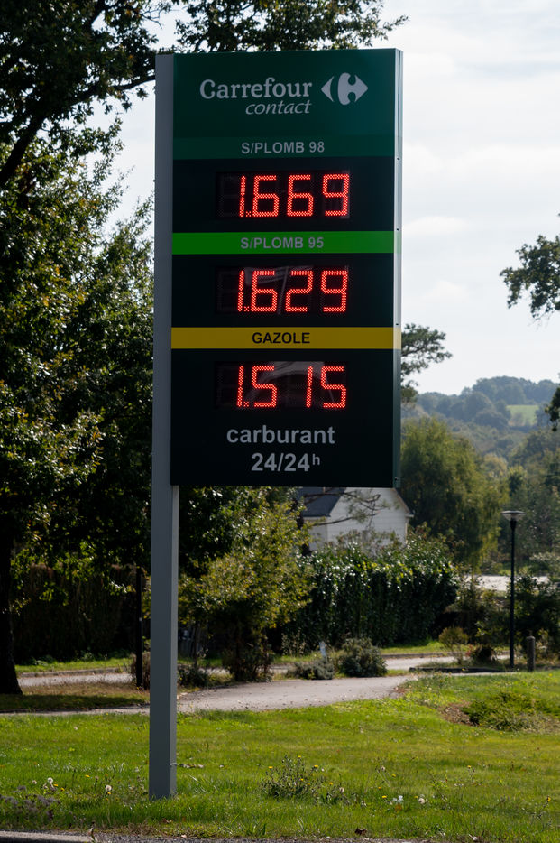 Inflation of the diesel price, which averages €1.5354 per liter at gas stations in France, a new record, after that of October 12, 2018 (€1.5331), just before the Yellow Vests crisis. This increase also concerns unleaded 95-E10, which reaches €1.60 compared to €1.56 in August 2013. Illustration photo of a gas station in Nantes.