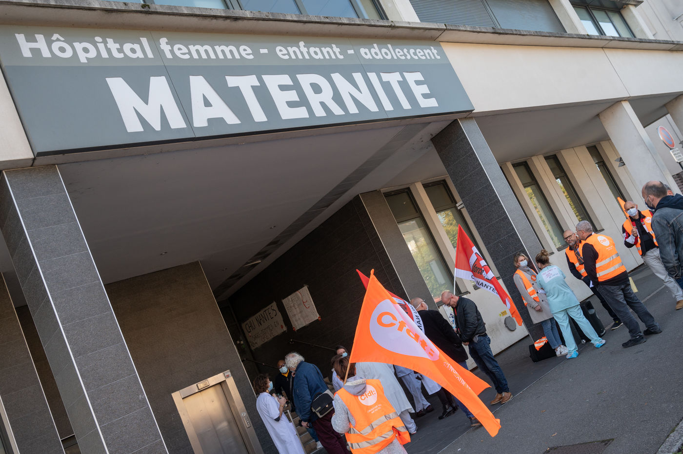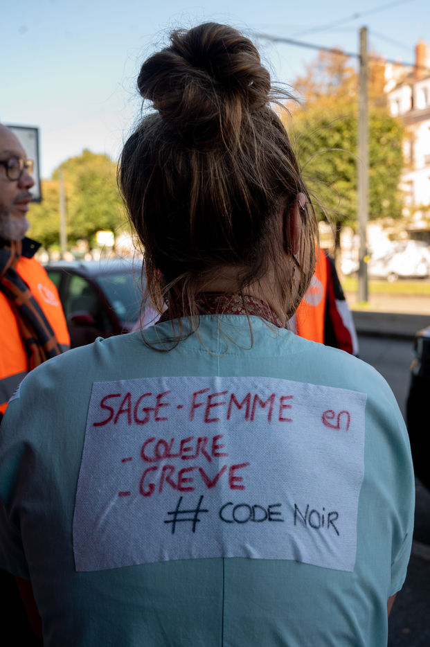 Les sages-femmes de la maternité du CHU de Nantes ont manifesté le 22 octobre 2021 pour réclamer une hausse de salaire et la reconnaissance d'un statut médical dans la continuité de la mobilisation nationale du 7 octobre à Paris.