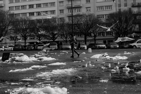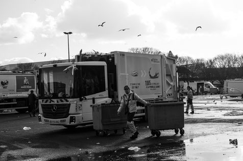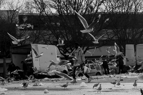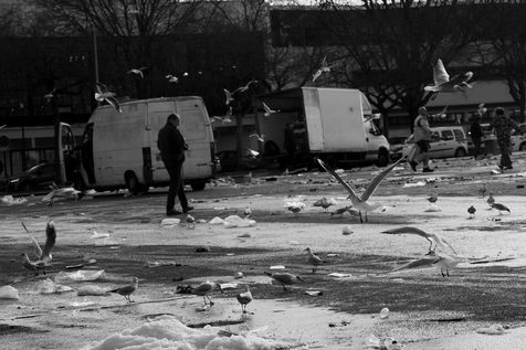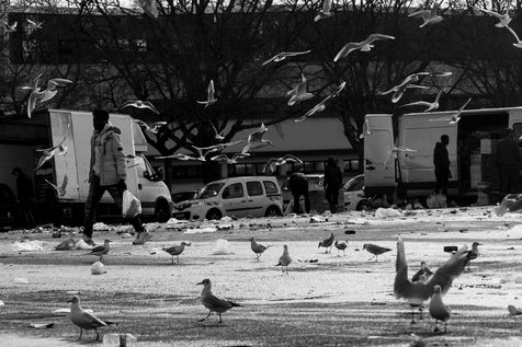 Series of street photographies taken in Nantes while the shopkeepers of the market of the place de la Petite Hollande fold their stalls and the seagulls enter in search of food.