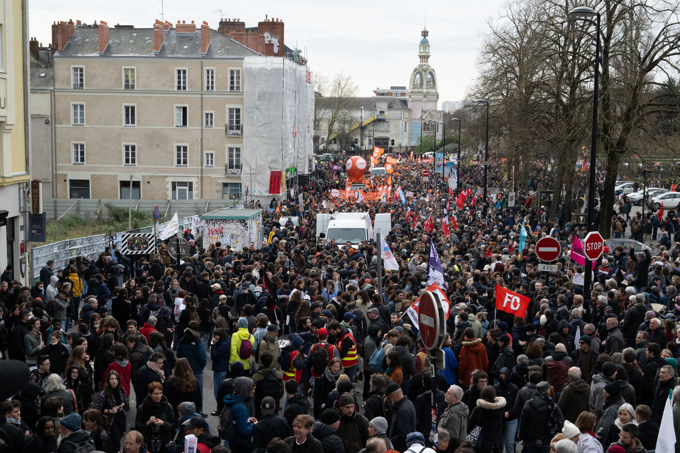 Des milliers de personnes ont de nouveau défilé à Nantes à l'occasion de la dixième journée de mobilisation intersyndicale contre la réforme des retraites adoptée par le gouvernement qui s'est affranchi du vote de l'Assemblée Nationale après l'utilisation du 49.3. De nombreux jeunes sont venus gonfler le cortège par rapport aux journées précédentes pour non seulement protester contre la réforme, mais aussi contre les violences policières.