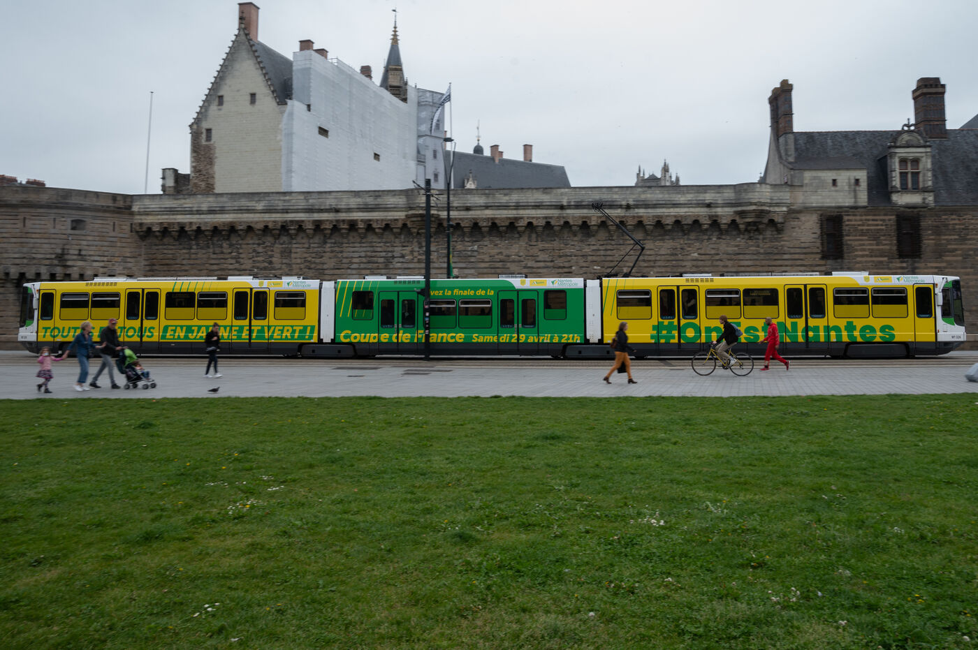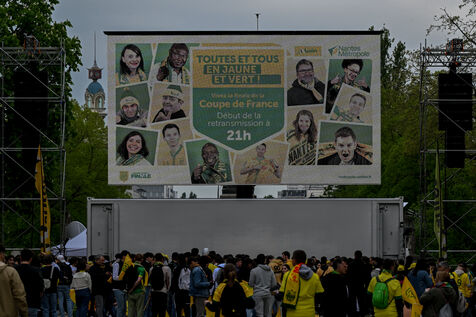 The atmosphere in the streets of Nantes as FC Nantes takes on Toulouse FC at the Stade de France for the final of the French Football Cup. For this occasion, the municipality has set up a fan zone in the city centre so that the Canaries' supporters can encourage their team which is putting its title back on the line one year after winning the French Cup 2022.