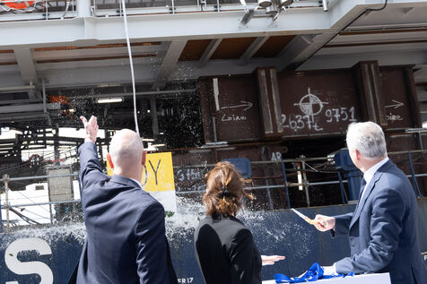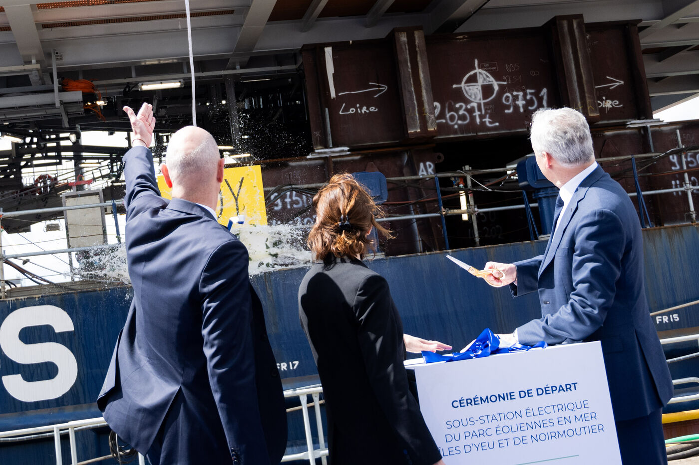 Bruno Le Maire, Ministre de l'Economie et des Finances et Roland Lescure Ministre délégué chargé de l'Industrie étaient aux Chantiers de l'Atlantique de Saint-Nazaire jeudi 2 mai 2024 à l'occasion de la signature du contrat entre RTE et le consortium Chantiers de l'Atlantique-Hitachi Energy prévoyant la construction de postes électriques destinés au déploiement de l'éolien offshore. Ils ont ensuite assisté à la cérémonie de départ de la sous-station électrique d'Engie déstinée à collecter l'électricité produite par le parc éolien des îles d'Yeu et de Noirmoutier.
