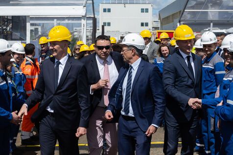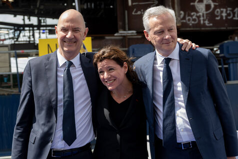 Bruno Le Maire, Minister for the Economy and Finance, and Roland Lescure, Minister Delegate for Industry, were at Chantiers de l'Atlantique in Saint-Nazaire on Thursday 2 May 2024 to sign the contract between RTE and the Chantiers de l'Atlantique-Hitachi Energy consortium for the construction of substations designed to collect the electricity generated by the deployment of offshore wind farms. They then attended the start-up ceremony for the Engie substation designed to collect the electricity generated by the wind farm on the islands of Yeu and Noirmoutier.