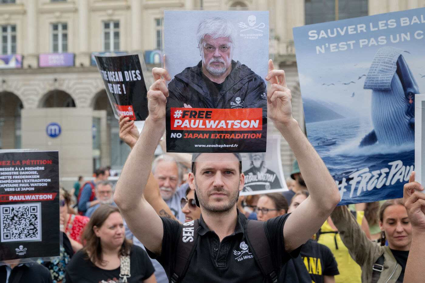 Samedi 3 aout 2024, une centaine de personnes se sont rassemblées à Rennes (France) pour demander la libération de Paul Watson fondateur de l'ONG Sea Shepherd qui a été arrété au Groenland par les autorités danoises le 21 juillet 2024 suite à la diffusion d'une "notice rouge" d'Interpol émise par le Japon. Les japonnais l'accusent de "conspiration d'abordage" après avoir causé des dommages à un navire baleinier dans Antarctique en 2010 ; Le capitaine agé de 73 ans risque d'être extradé vers le Japon.