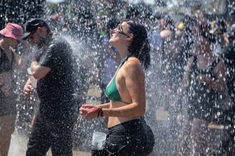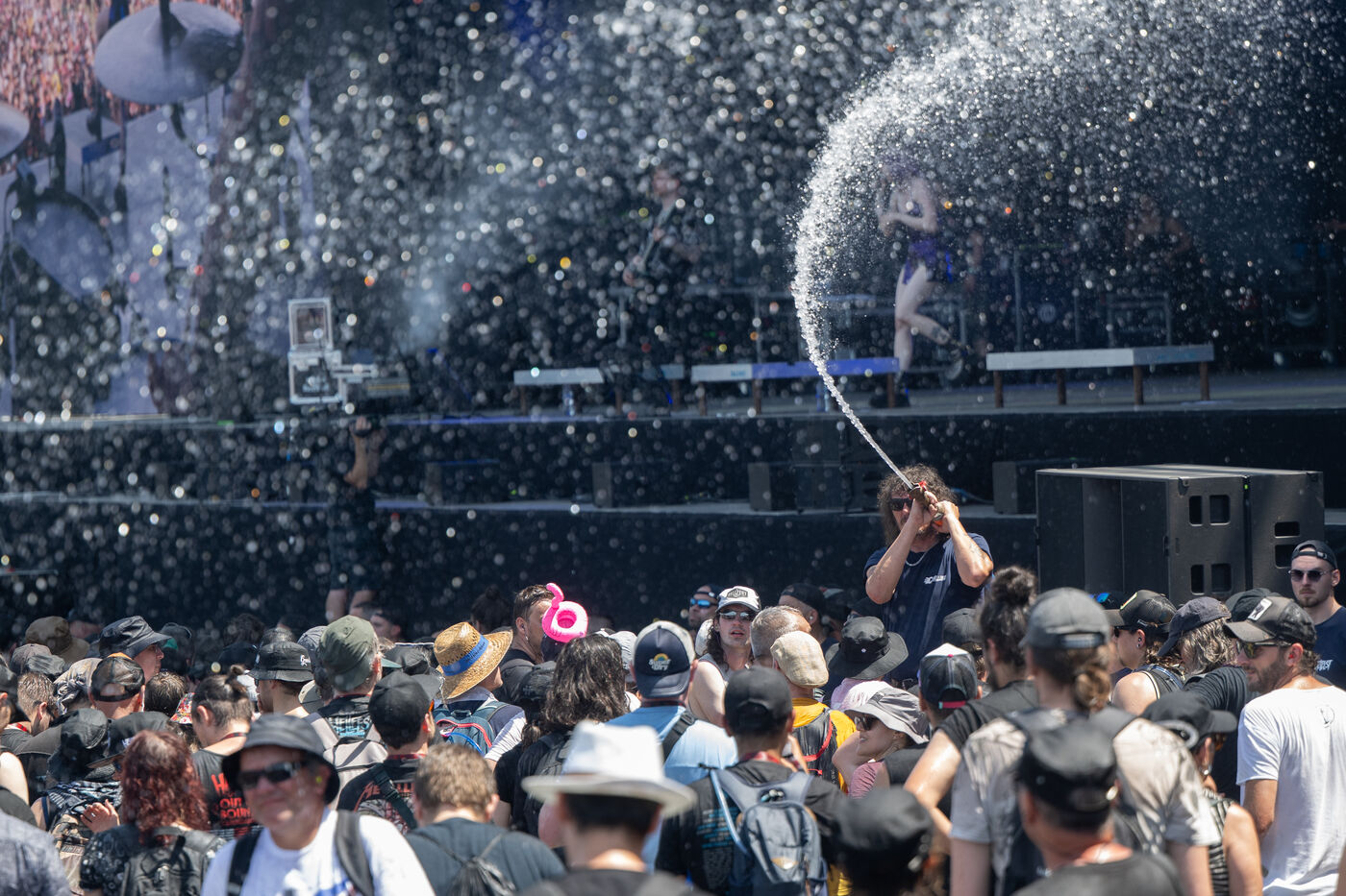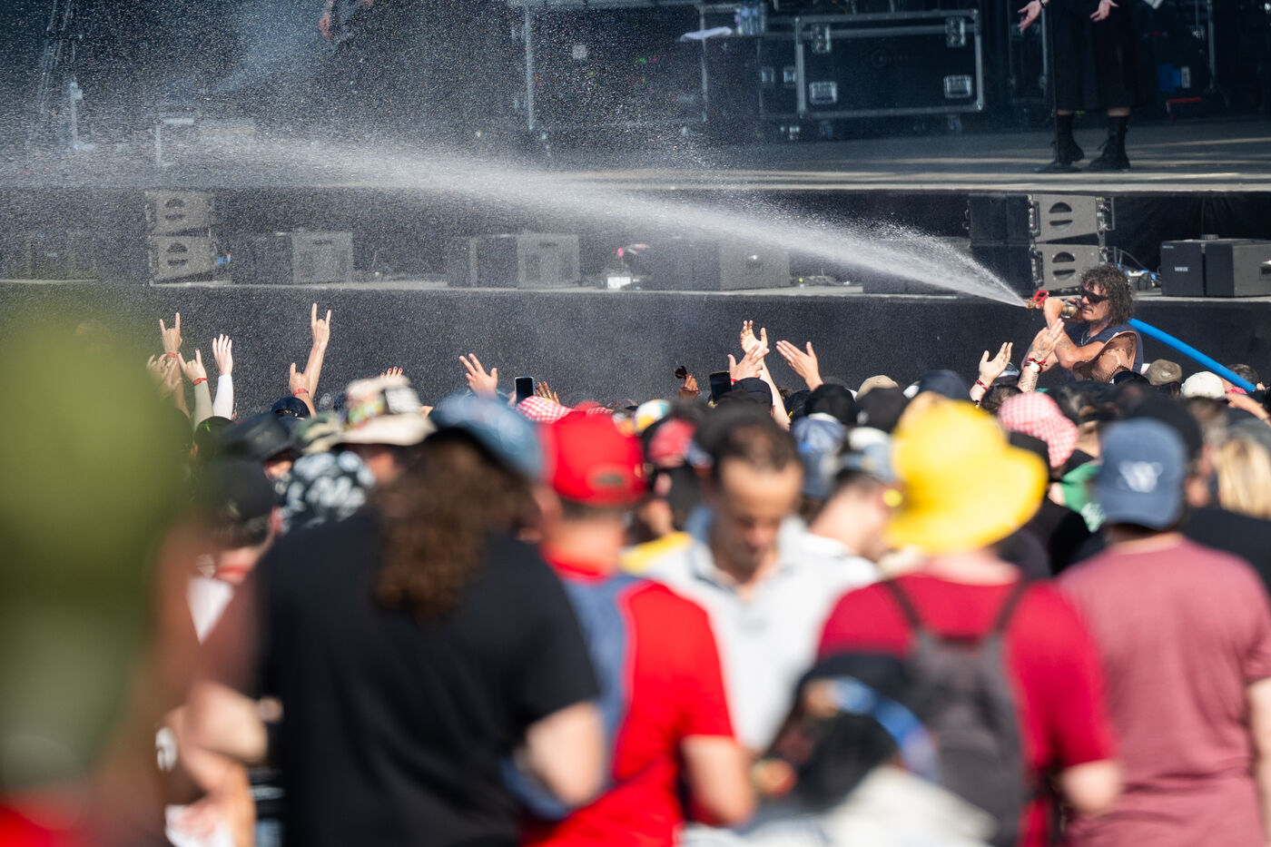 Face à la canicule qui s'abat sur la Loire-Atlantique, les bénévoles du Hellfest arrosent les festivaliers pour les rafraichir. Photo prise le 20 juin 2025 à Clisson.
