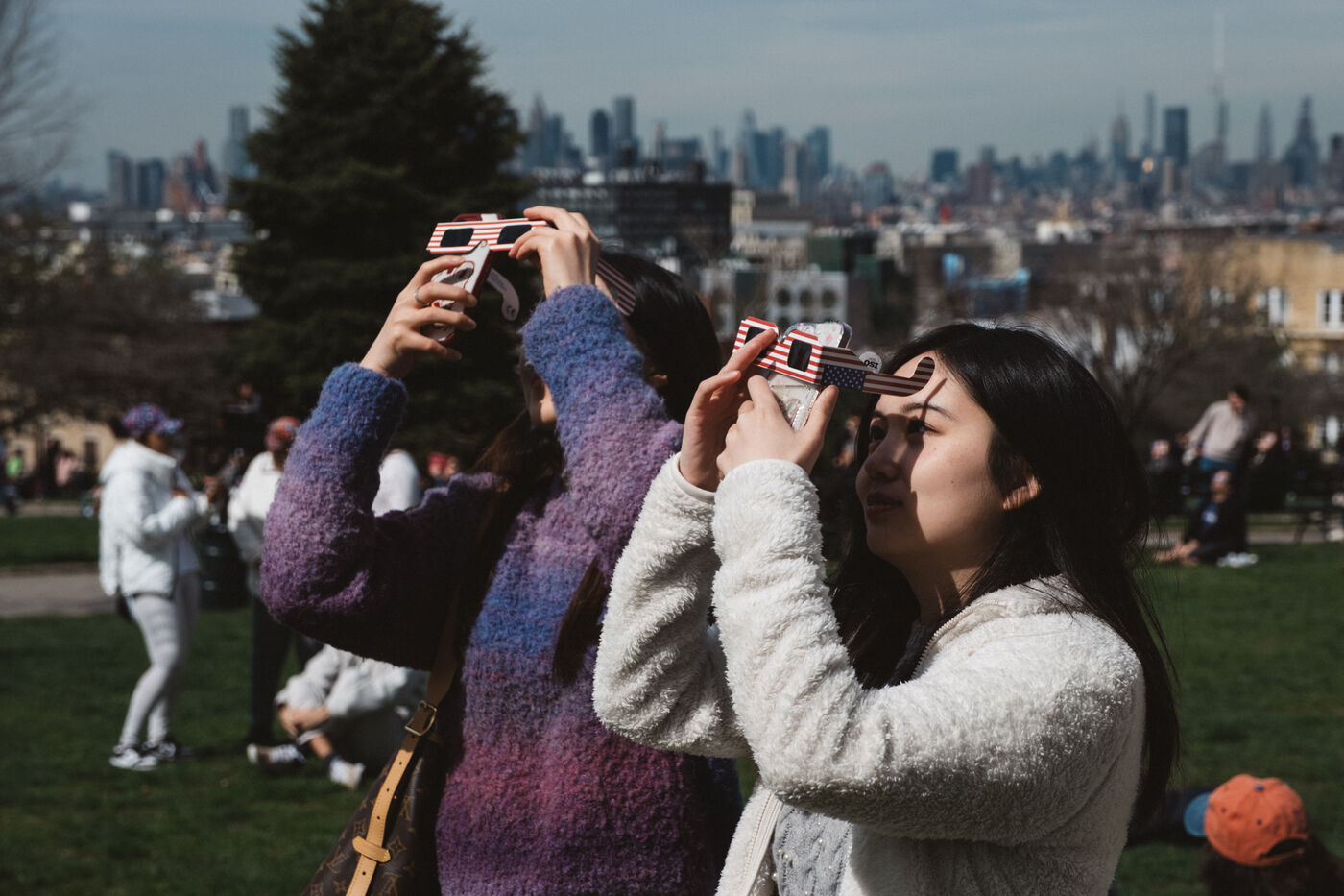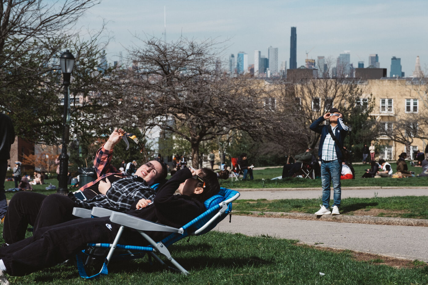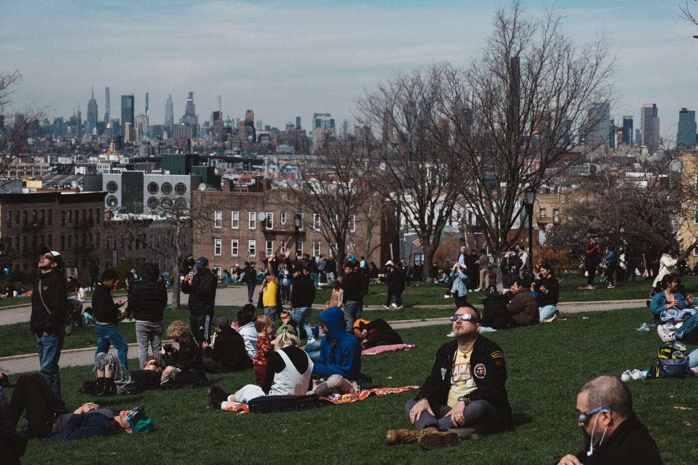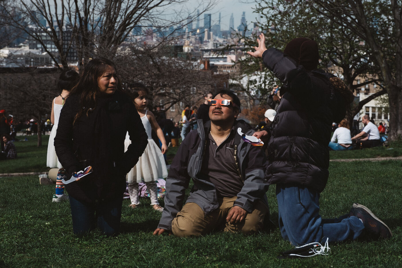 People gathered in New York City to see a partial solar eclipse, with the moon covering about 90 percent of the sun.