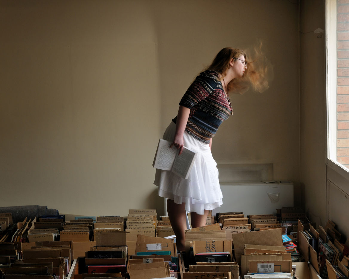 Nous avons choisi de travailler la mise en scène, l’univers du livre venant perturber le réel. Il s’agit d’une promenade, au gré de nos idées, de nos envies, dans le monde des livres ; l’important étant, pour nous, de montrer cette échappée à travers la lecture, le glissement du monde réel vers l’imaginaire.