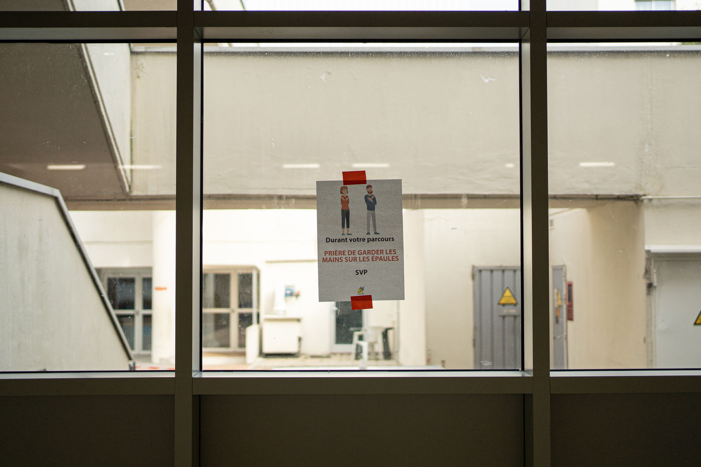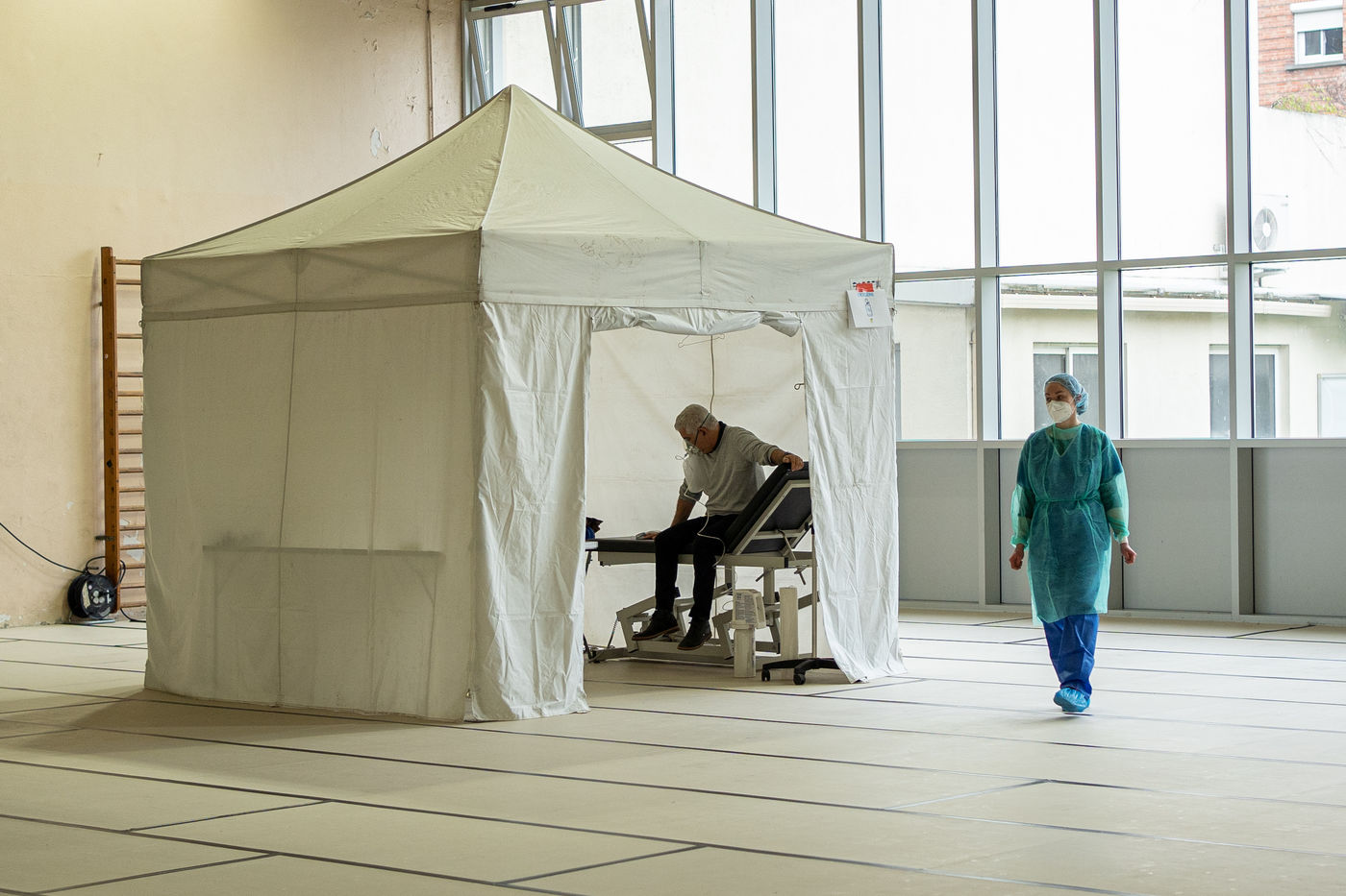 The floor is covered with tatamis, but it is no longer for practicing judo, karate, or any other martial art. On the initiative of the liberal doctors of Saint-Mandé/Vincennes, the Roger Vergne gymnasium has seen 30 to 40 people potentially suffering from Covid-19 in the last few days. On the walls posters ask them to keep their hands on their shoulders so as not to touch anything. On the floor, arrows made of red tape show them the way. At each step, a table, a sign saying "do not touch the table", and a bottle of hydroalcoholic gel. Between the basketball baskets and the handball cages one comes here to get tested for Covid19, by prescription only or if one is a medical staff member.