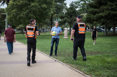 Une société de securité privée Archange Sécurité Privée organise le respect des consignes données par la ville de Toulon pour la réouverture des plages, à savoir, l'interdiction de s'asseoir sur le sable, de jouer avec un ballon, d'être sur la pelouse. Ils organisent egalement les horaires (8h00-18h00) d'ouverture et de fermeture.