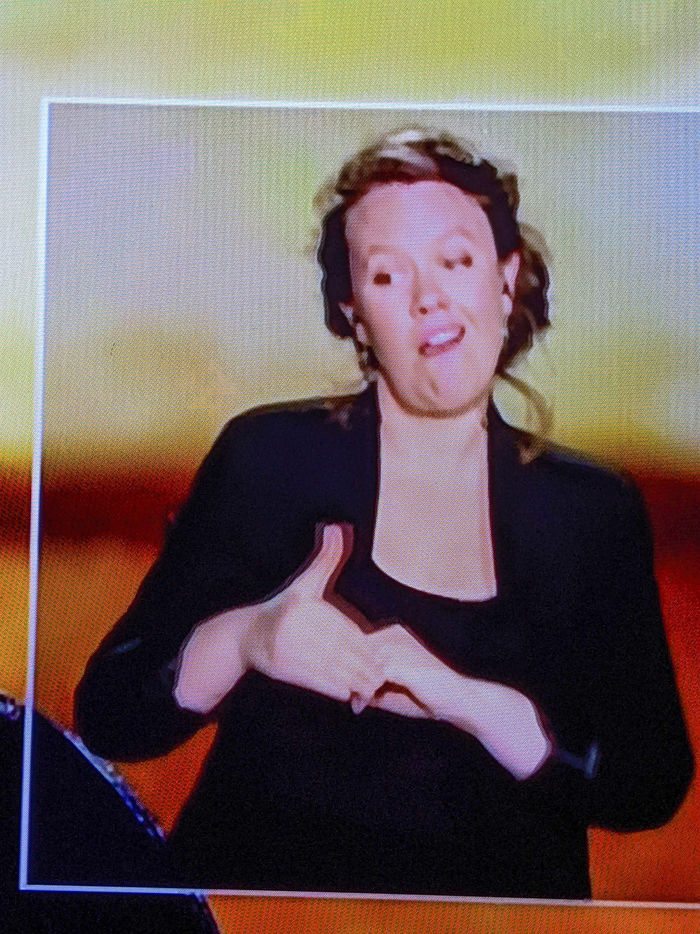 Focus on the sign language interpreter during the televised debate between Emmanuel Macron and Marine Le Pen. Screenshot.
