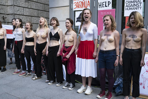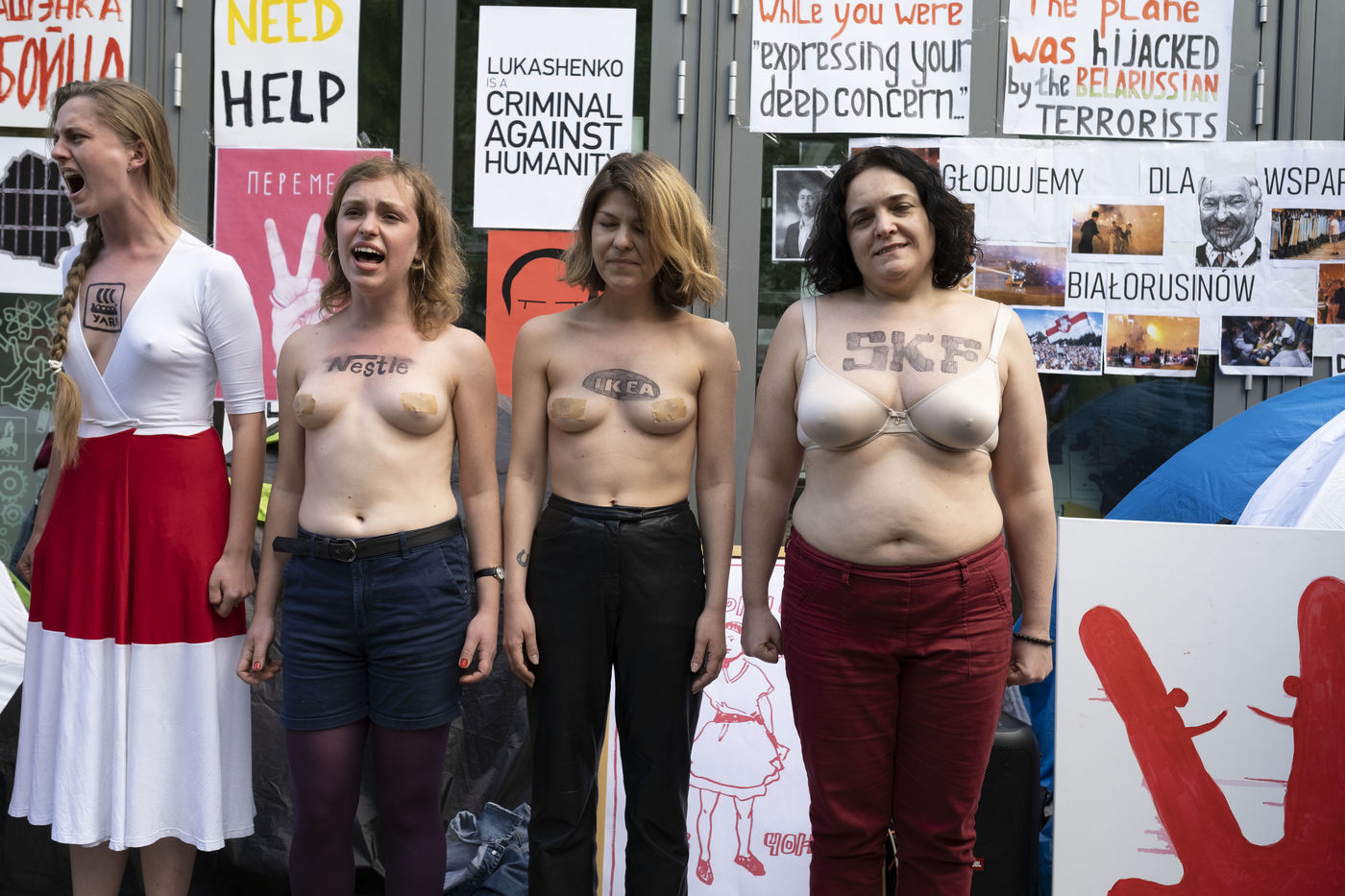 Des femmes biélorusses ont organisé un happening afin de dénoncer les sociétés qui collaborent avec la Bielorussie. Cinq citoyens biélorusses ont entamé une grève de la faim, devant le siège du parlement européen à Varsovie, en signe de protestation pour soutenir le journaliste de l opposition Roman Protassevitch, détenu par Alexander Lukashenko, en Biélorussie.