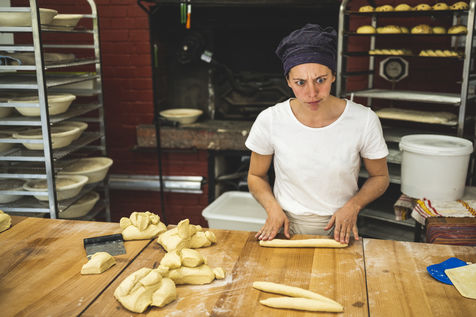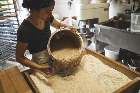 Before putting the dough in the oven, Cecile weighs, cuts and shapes the breads.