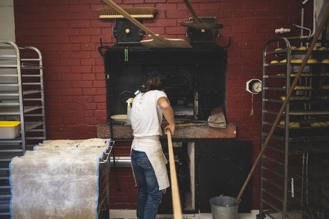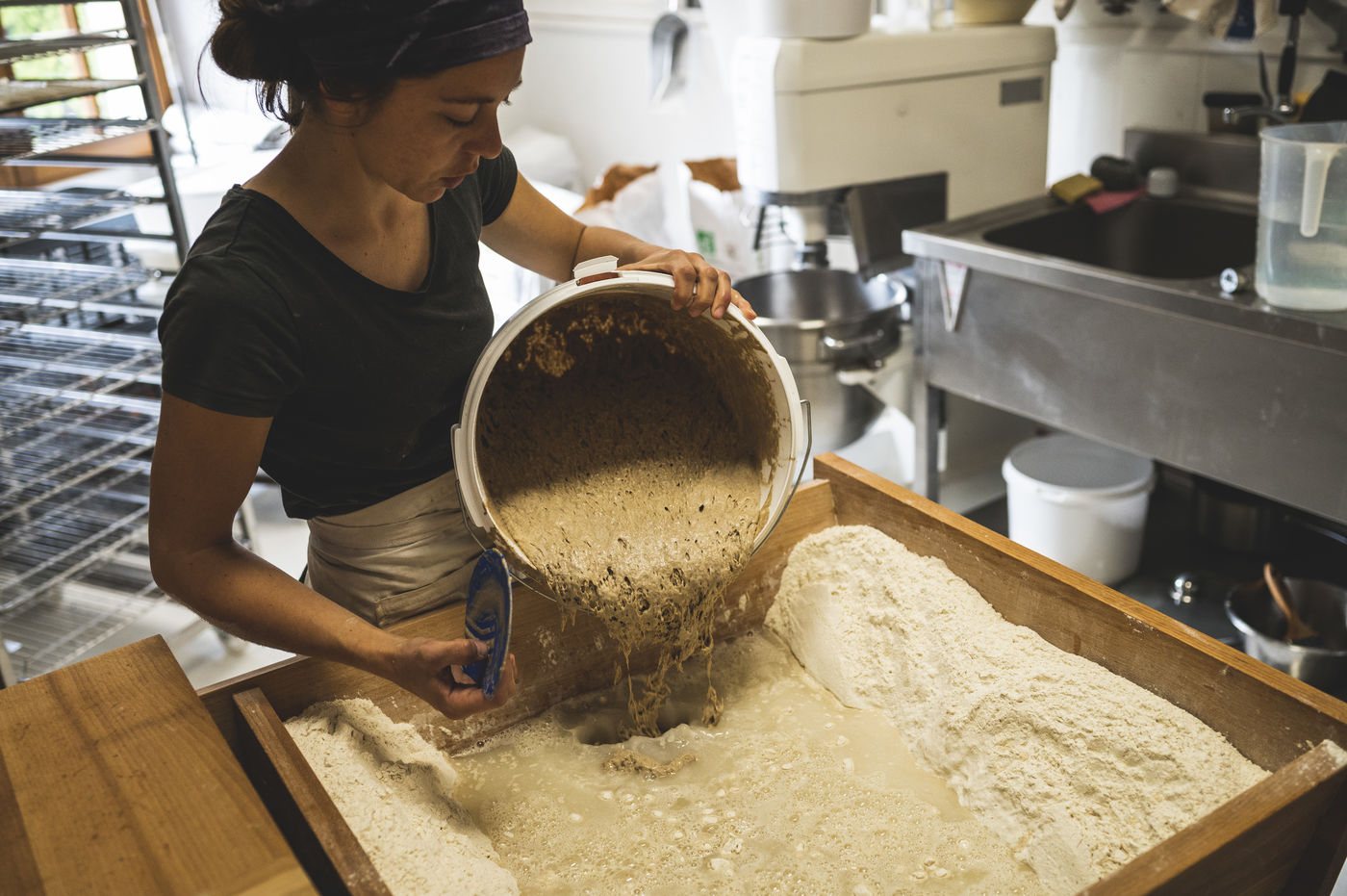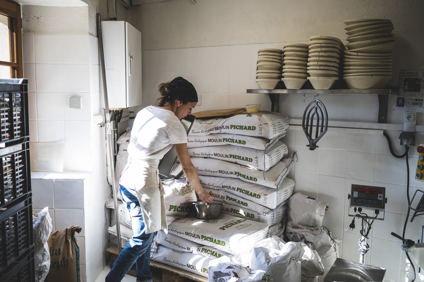 Tous les jours ou presque, elle assemble avec précision les éléments de notre pain quotidien, pour ensuite redémarrer ce four ancestral et y cuire ses pates bio.