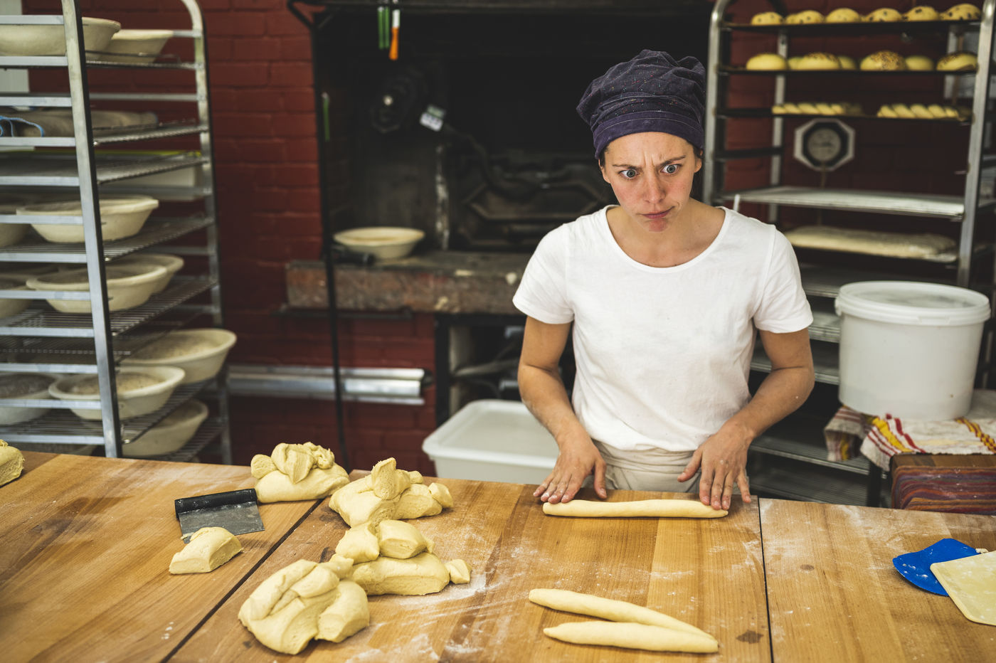 Avant la mise en four, préalablement chauffe, Cecile pèse, coupe et met en forme les pains.