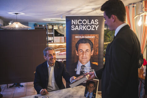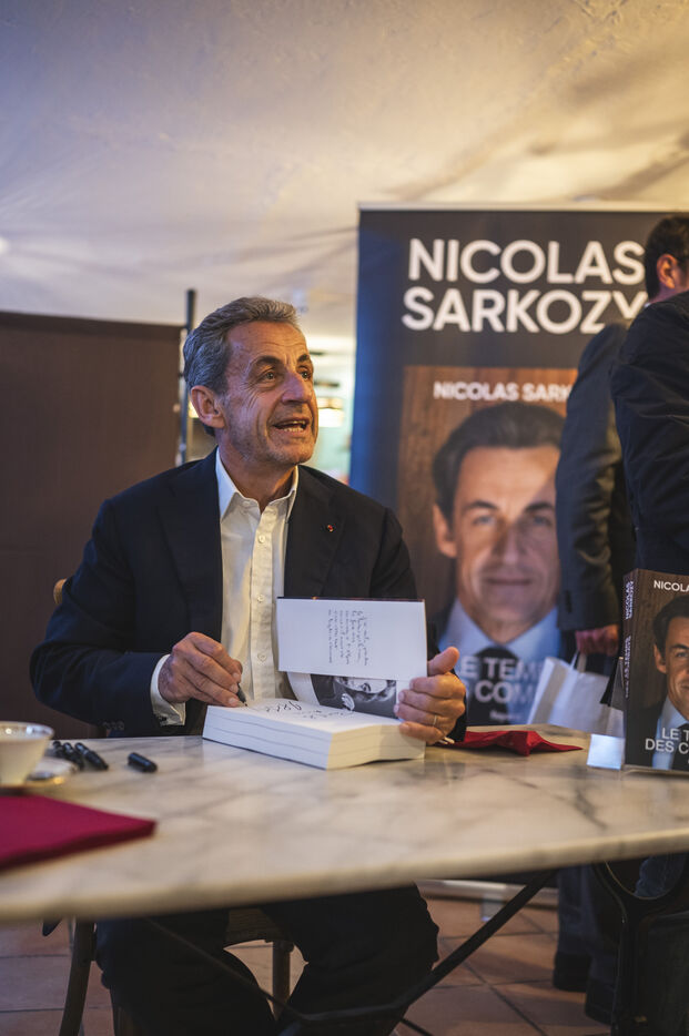 Former French president Nicolas Sarkozy signed his latest book, "Le temps des combats", published by Fayard. Session organized at the Cannes bookshop "Autour d'un livre" on November 2, 2023 in Cannes.
