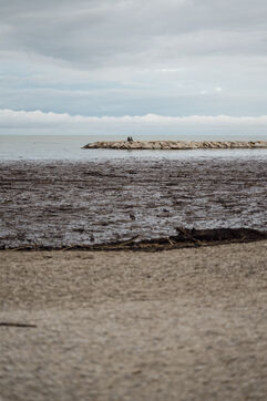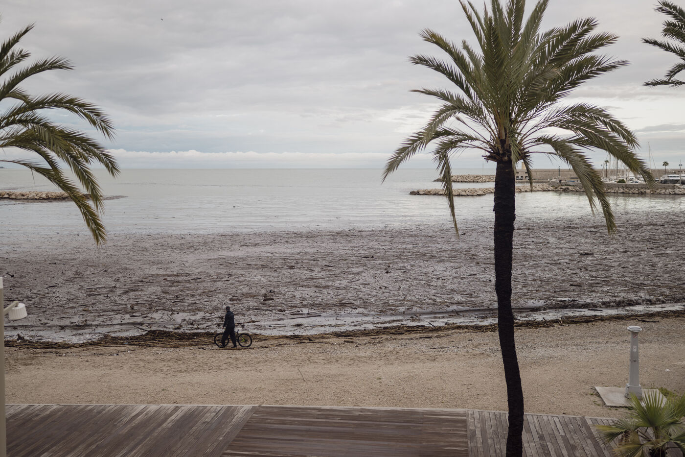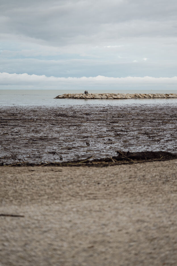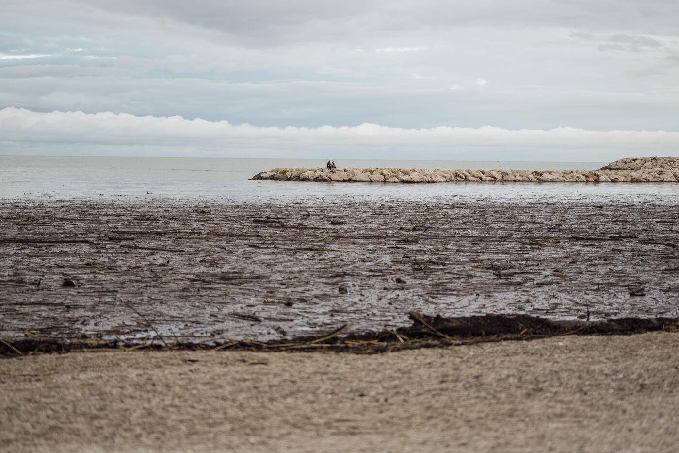 Image showing the beach and sea at Les Sablettes in Menton, southern France, covered with driftwood due to heavy rainfall the previous day. Menton, April 17, 2025.
