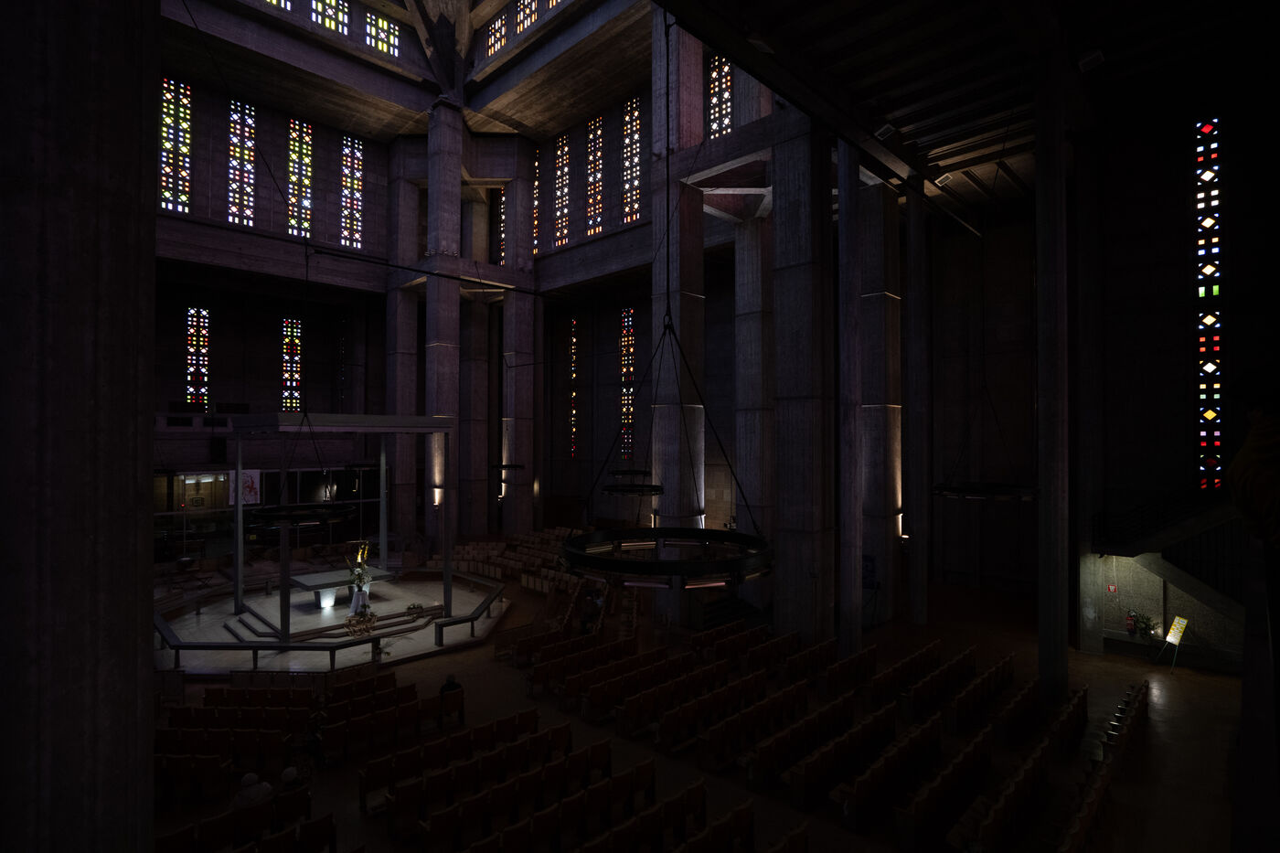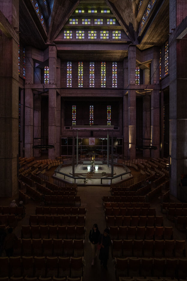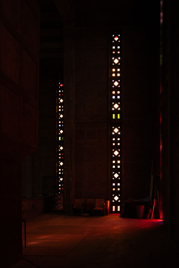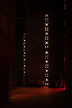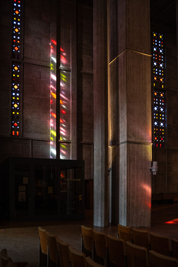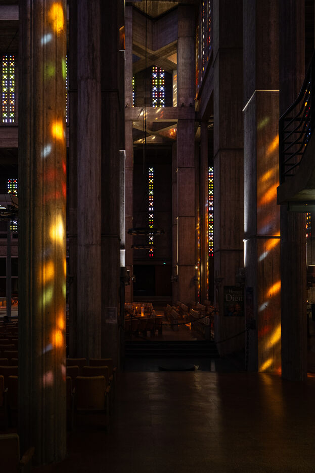 The stained glass windows (some 12,568 pieces) were created - and mouth-blown - by the artist Maguerite Hure herself. Deliberately eschewing figurative religious representations, the artist chose to use colour alone, giving the building a luminous and aesthetic unity that is inseparable from its spiritual atmosphere.