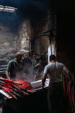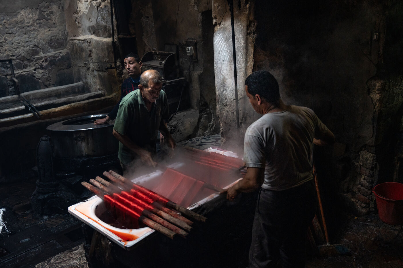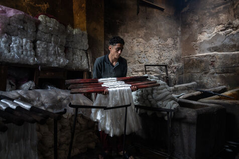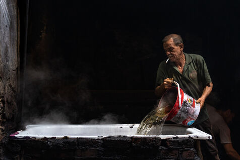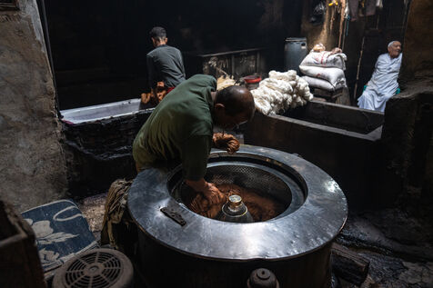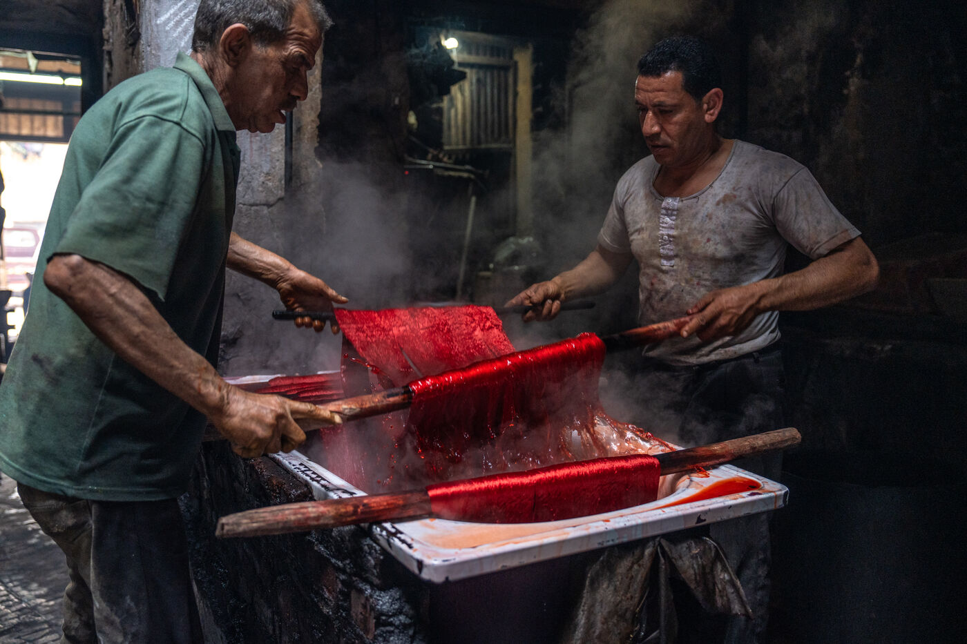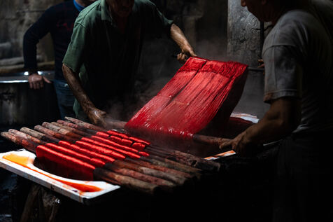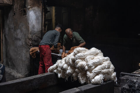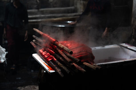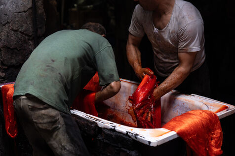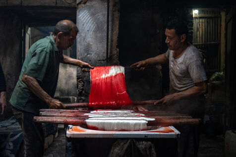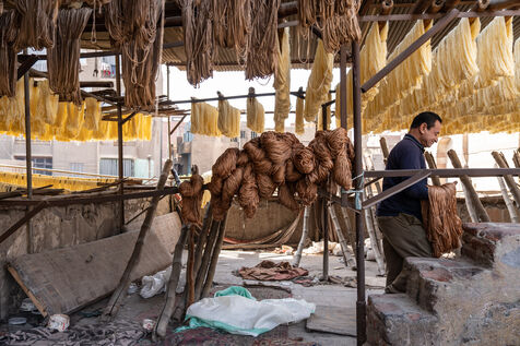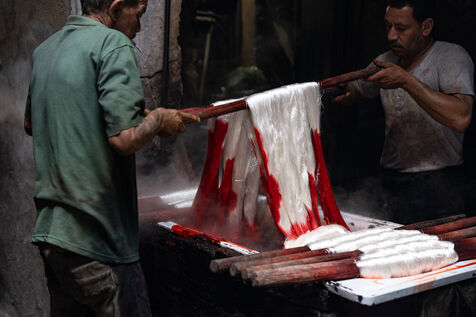 Dans cette teinturerie du quartier El Darb El Ahmar, fondée en 190, les artisans continuent toujours aujourd'hui de teindre les fils de façon traditionnelle, à la main, dans de grands bacs d'eau chaude, sous l'oeil expert de son propriétaire, Salama. Une fois teintés, les écheveaux de fils sont alors montés sur le toit où ils seront étendus pour sécher sur de longues tiges en bois.