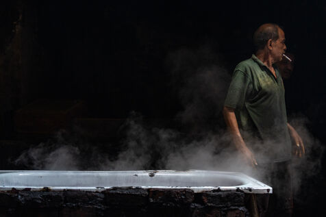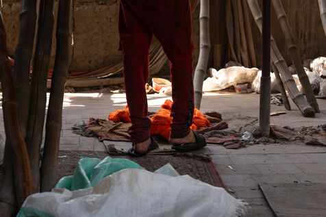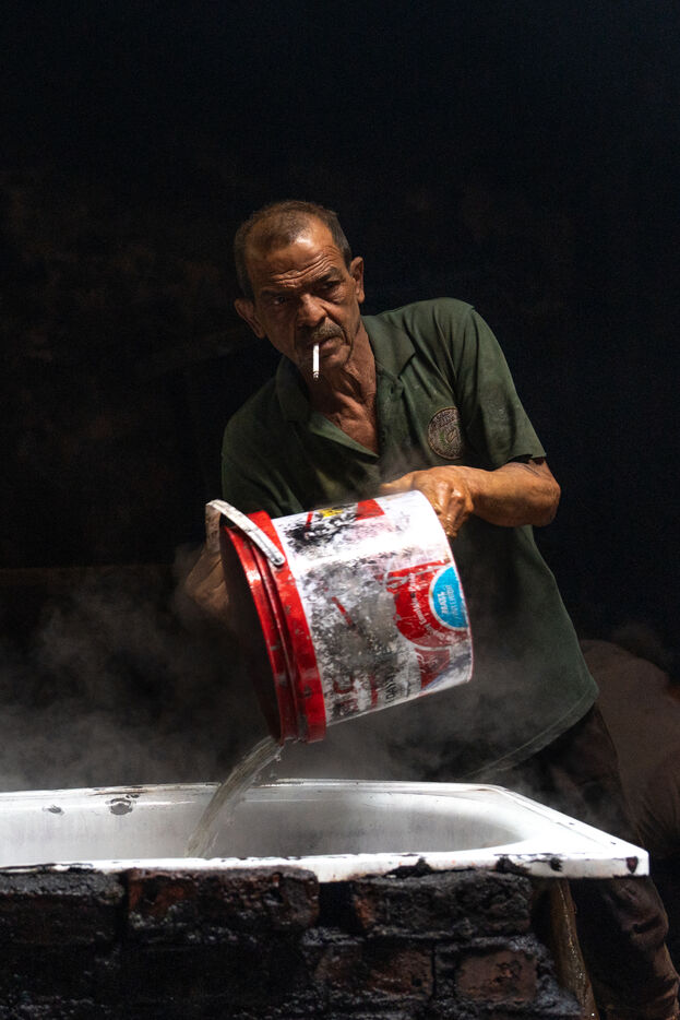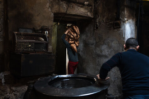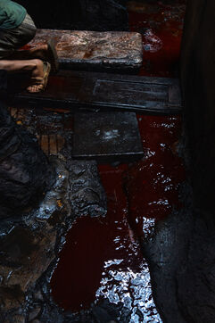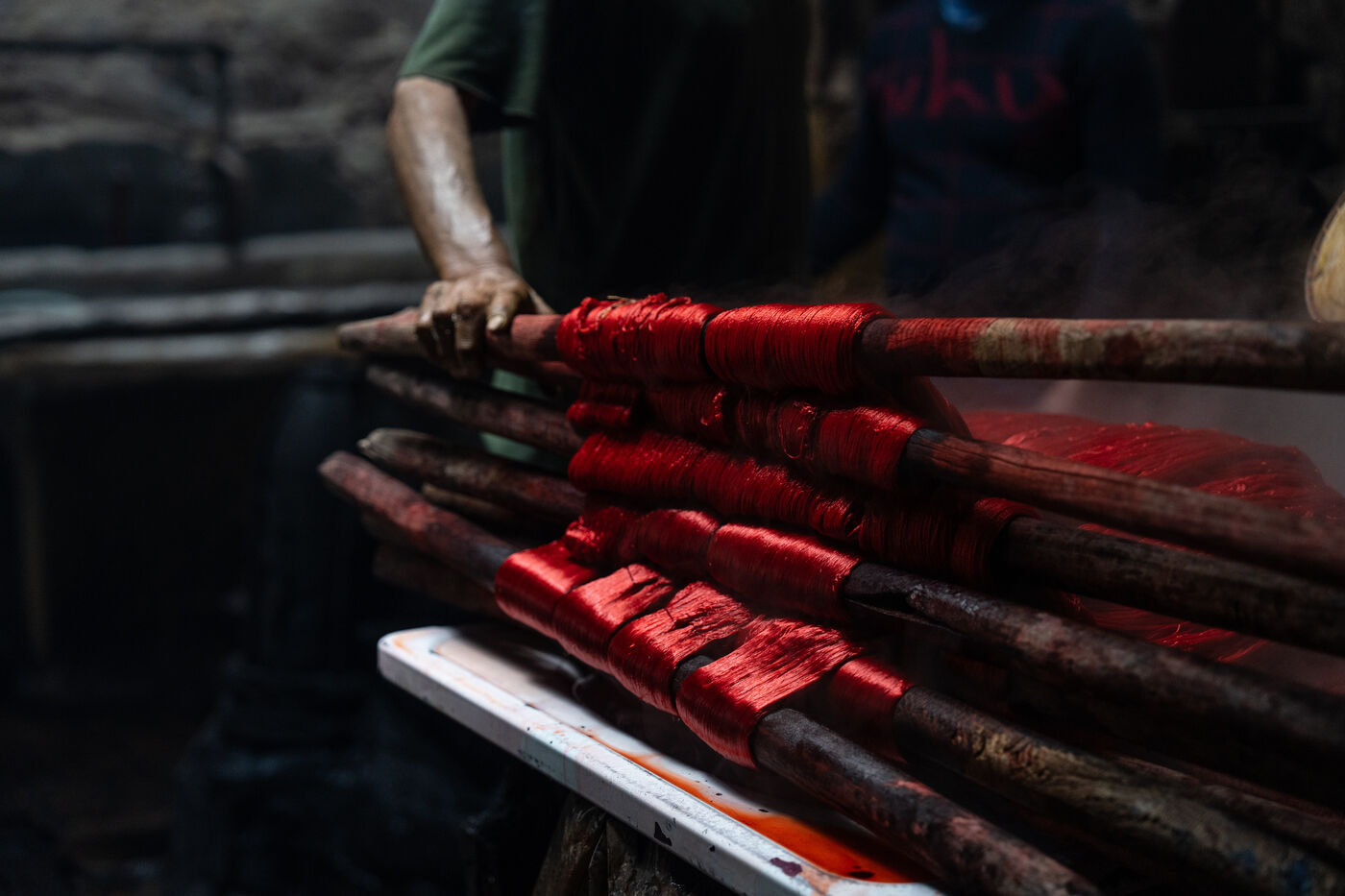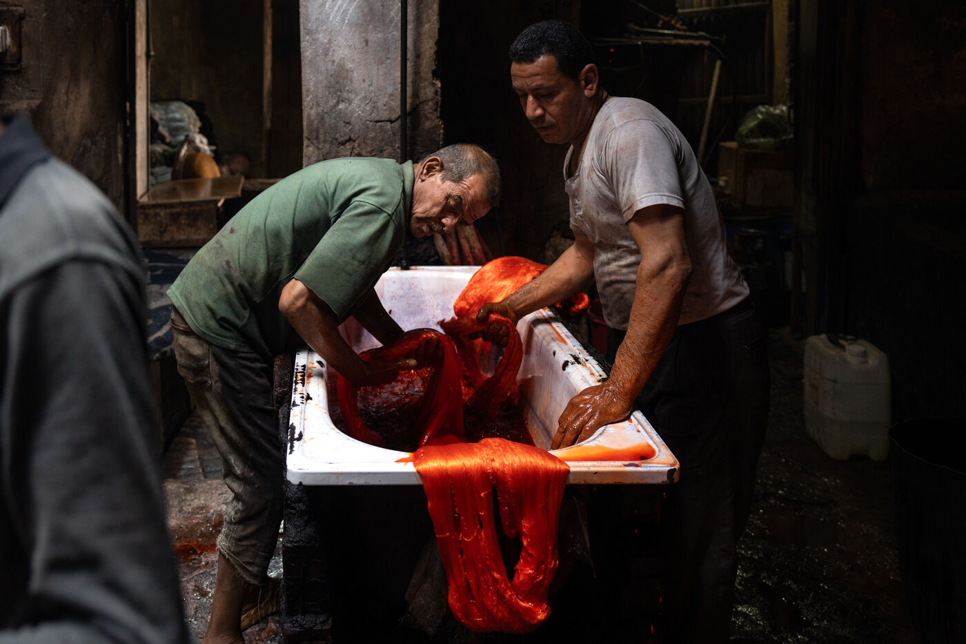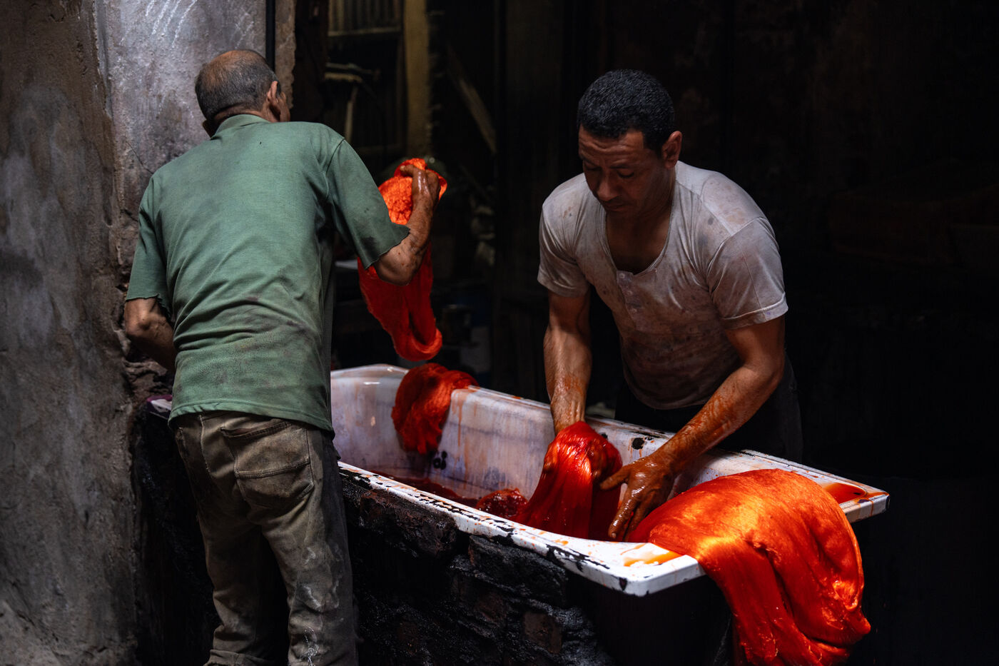 Dans cette teinturerie du quartier El Darb El Ahmar, fondée en 190, les artisans continuent toujours aujourd'hui de teindre les fils de façon traditionnelle, à la main, dans de grands bacs d'eau chaude, sous l'oeil expert de son propriétaire, Salama. Une fois teintés, les écheveaux de fils sont alors montés sur le toit où ils seront étendus pour sécher sur de longues tiges en bois.