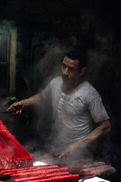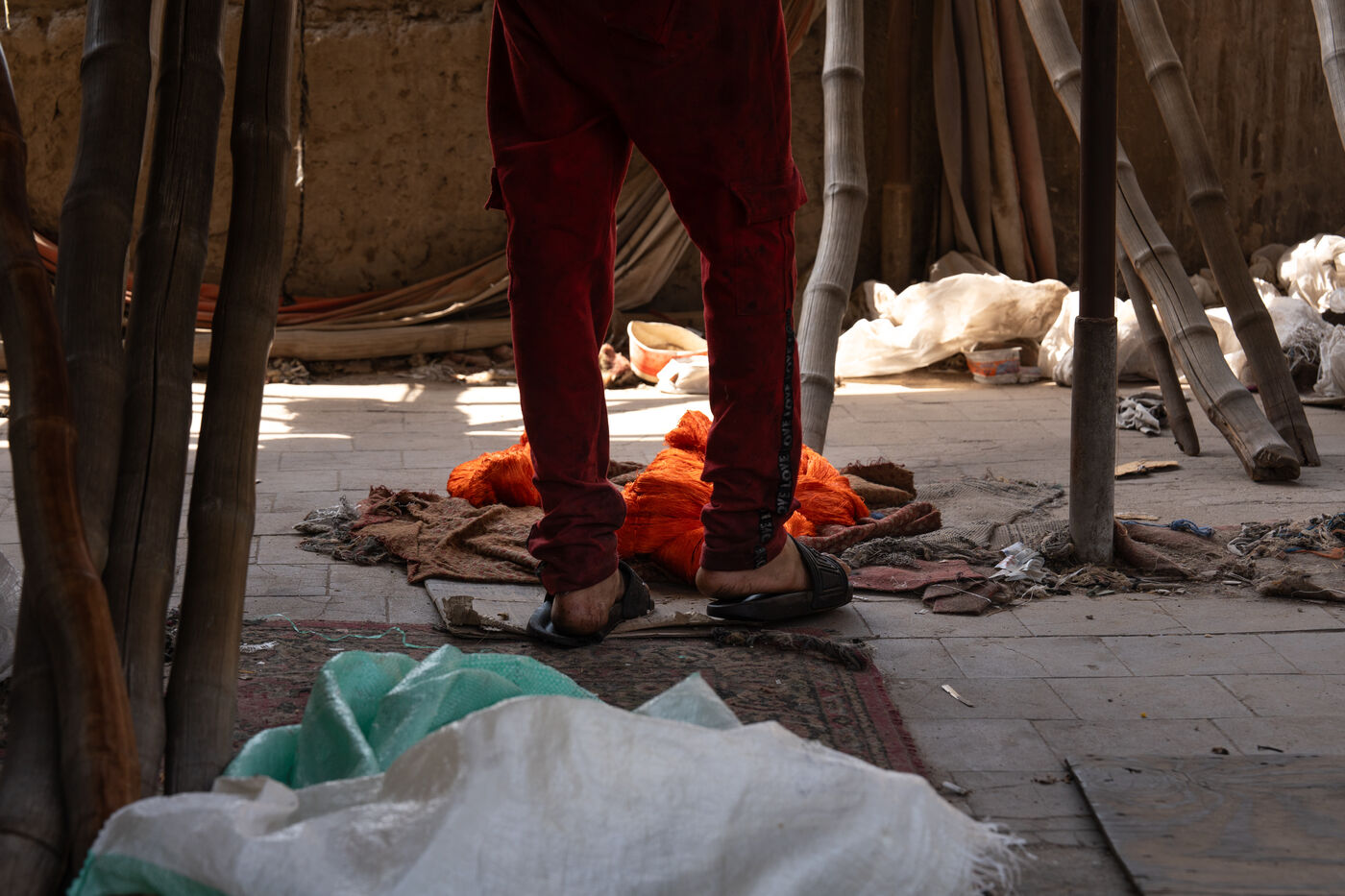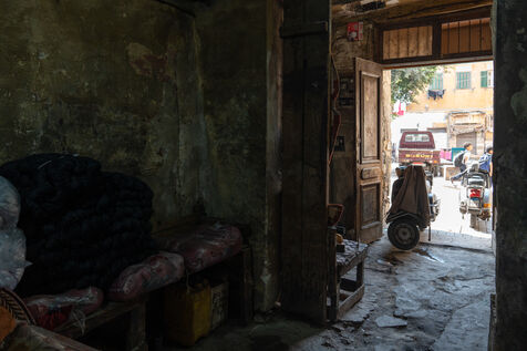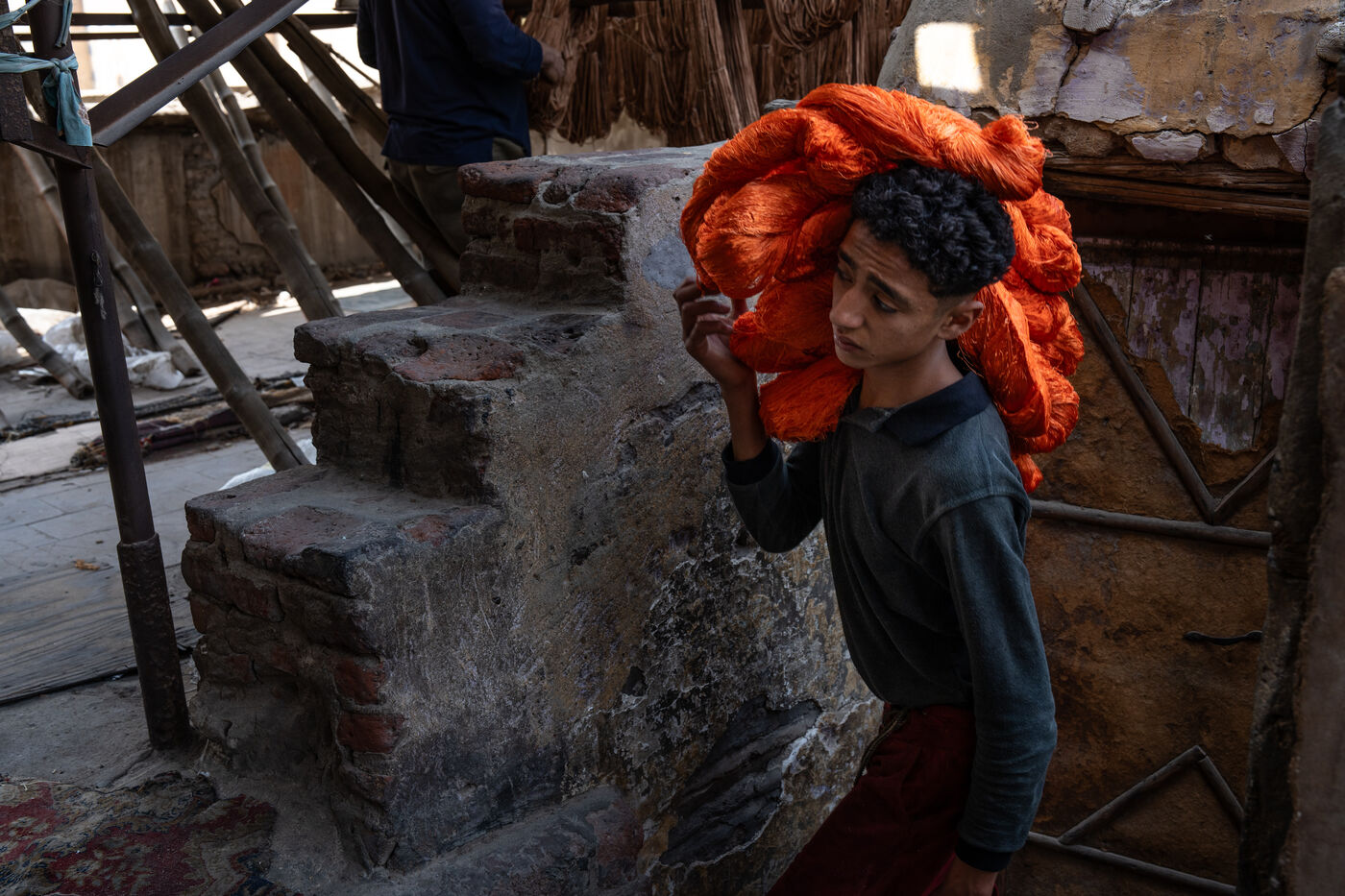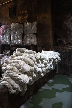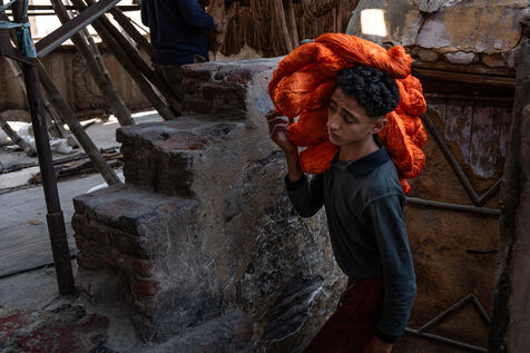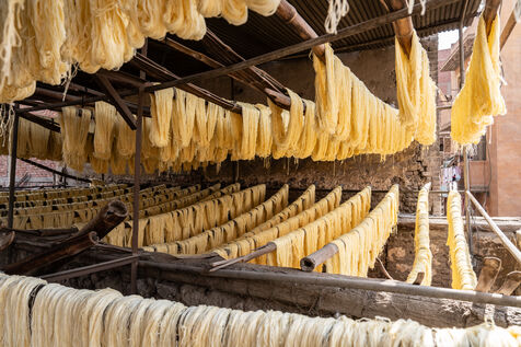 In this dye house in the El Darb El Ahmar district, founded in 190, the craftsmen still continue to dye the yarns in the traditional way, by hand, in large vats of hot water, under the expert eye of its owner, Salama. Once dyed, the skeins of yarn are taken up to the roof where they are laid out to dry on long wooden poles.