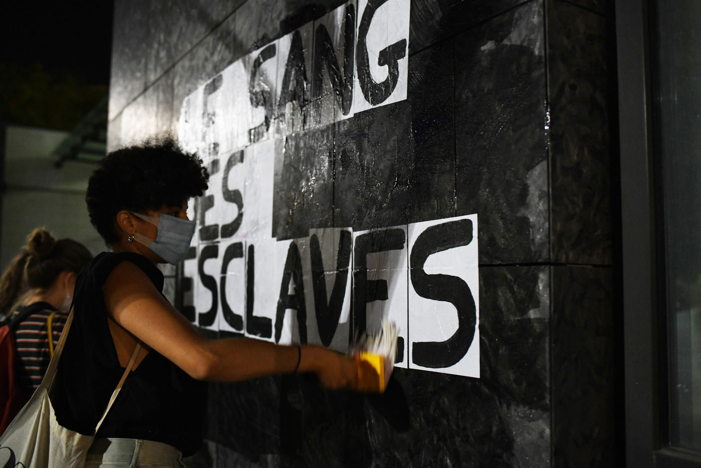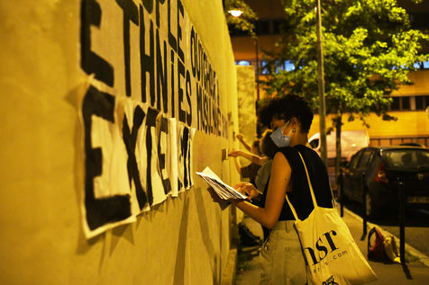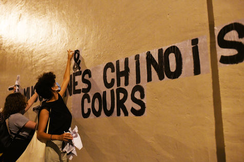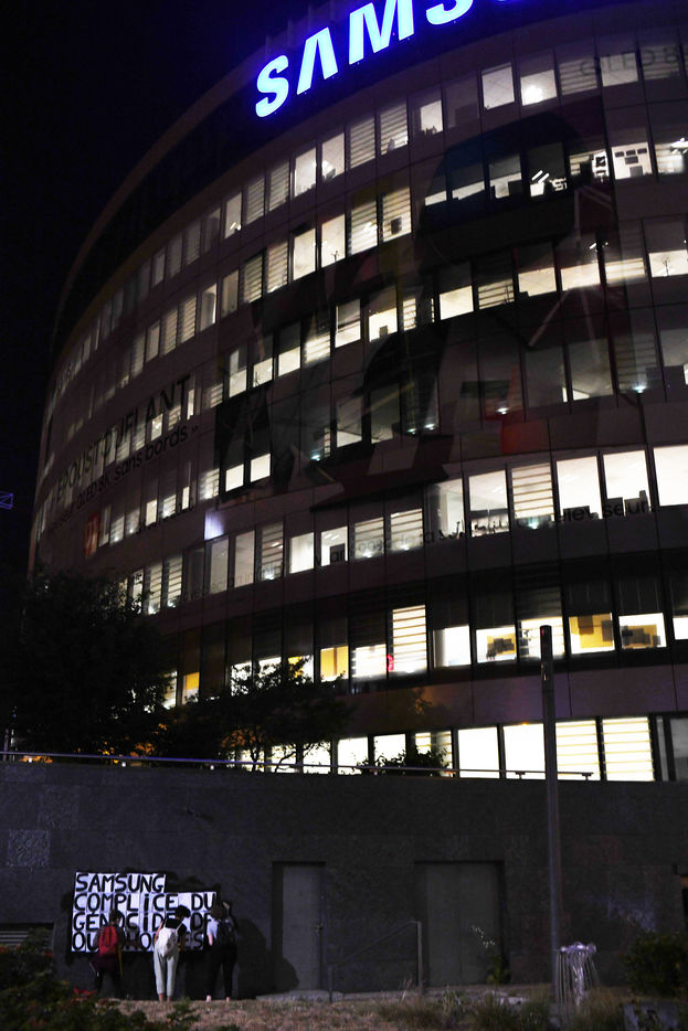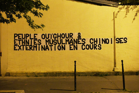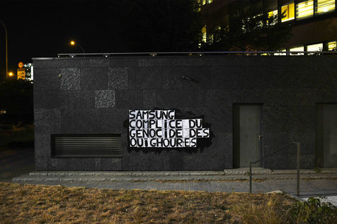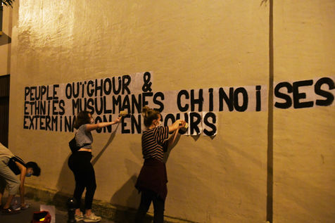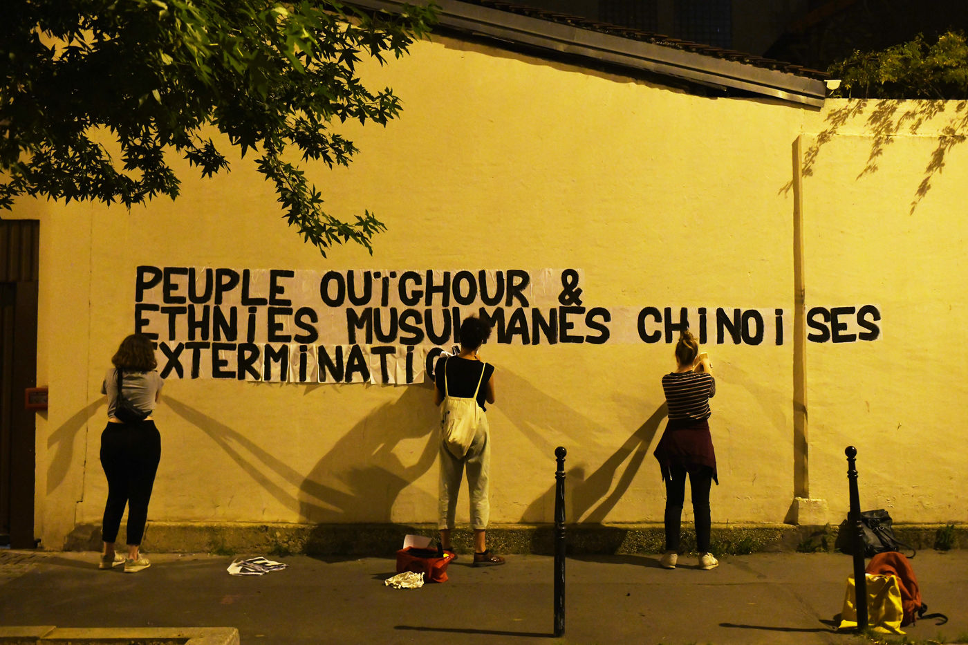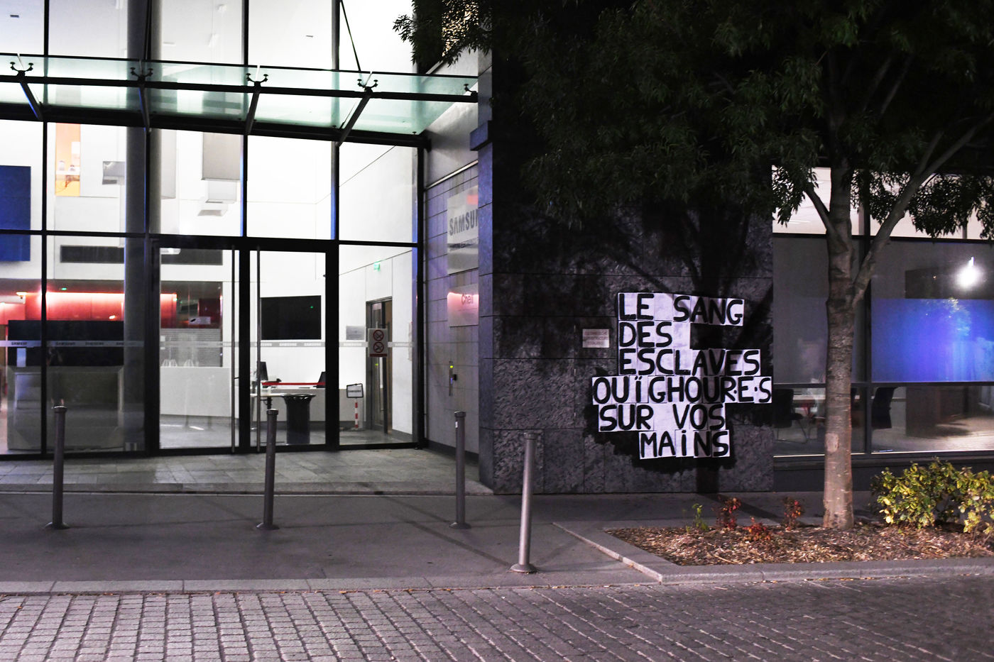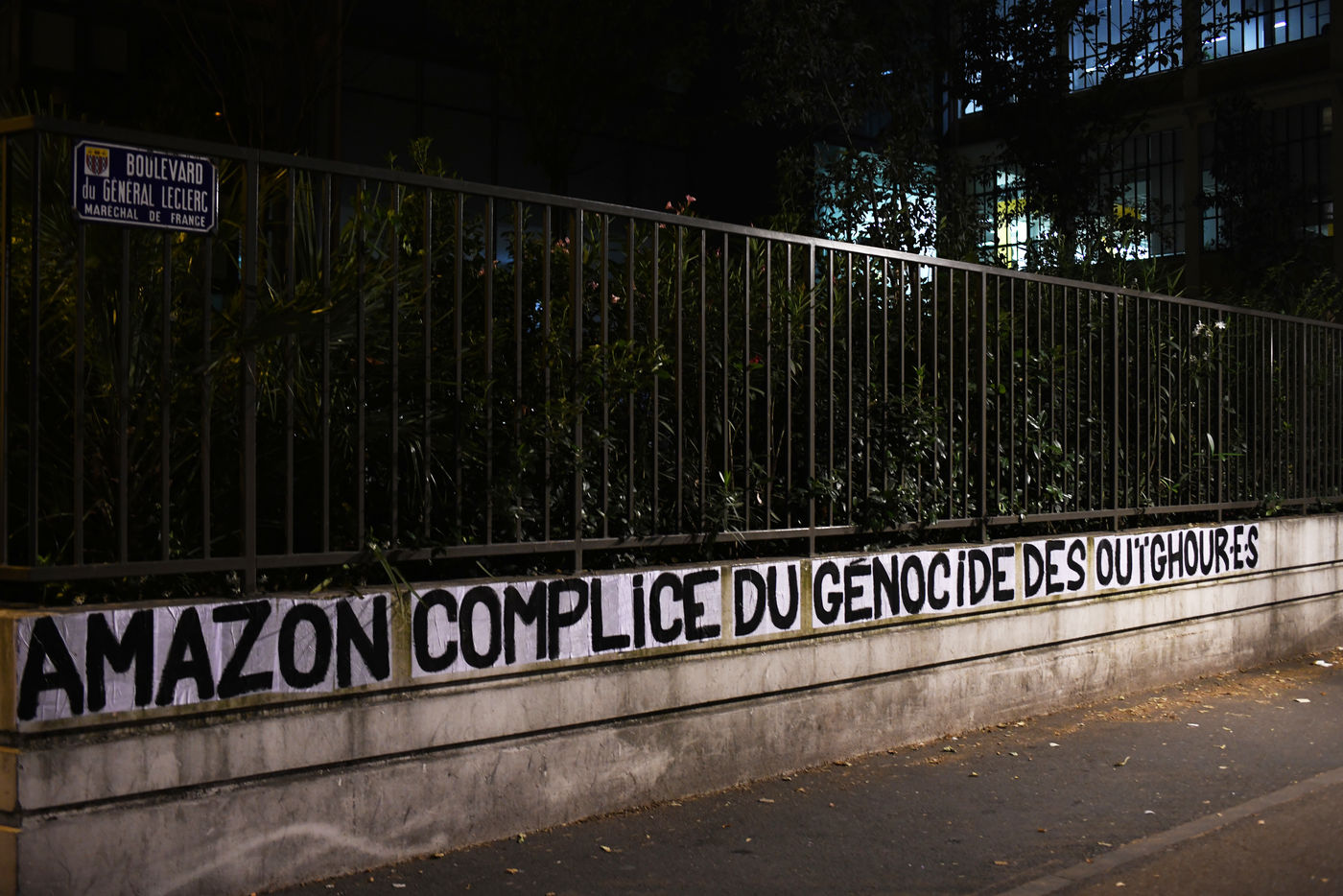 Dans la nuit, les membres du groupe Collages Féminicides Paris ont affiché sur les murs de grandes entreprises telles que Samsung et Amazon des messages dénonçant l'exploitation du peuple ouïghour dans leurs usines chinoises, ainsi que le génocide se déroulant actuellement dans le pays.