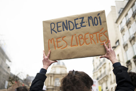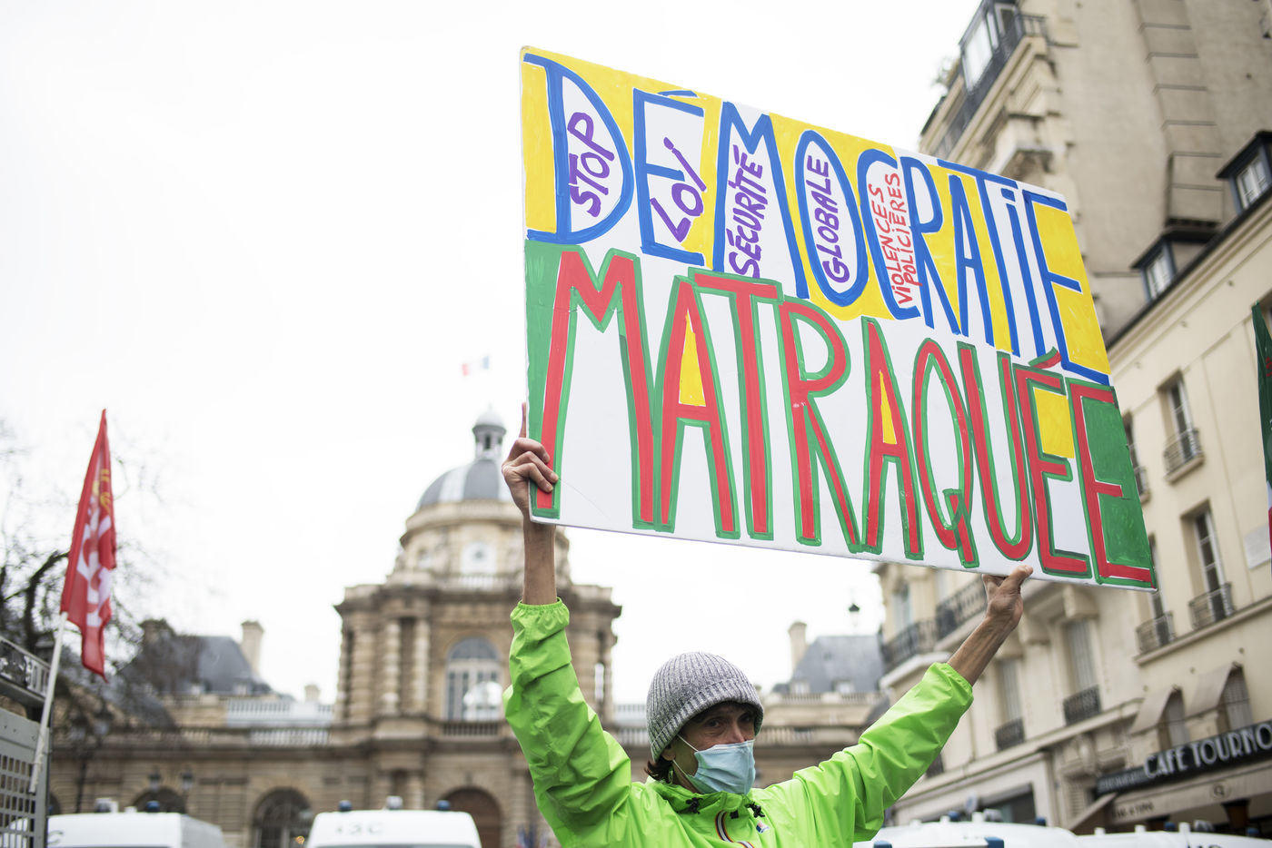 Nouvelle journée de manifestation contre la loi Sécurité globale et pour les libertés à Paris, le 16 Mars 2021, devant le Sénat. C'est aujourd'hui que le Sénat entame l'examen du projet de loi.