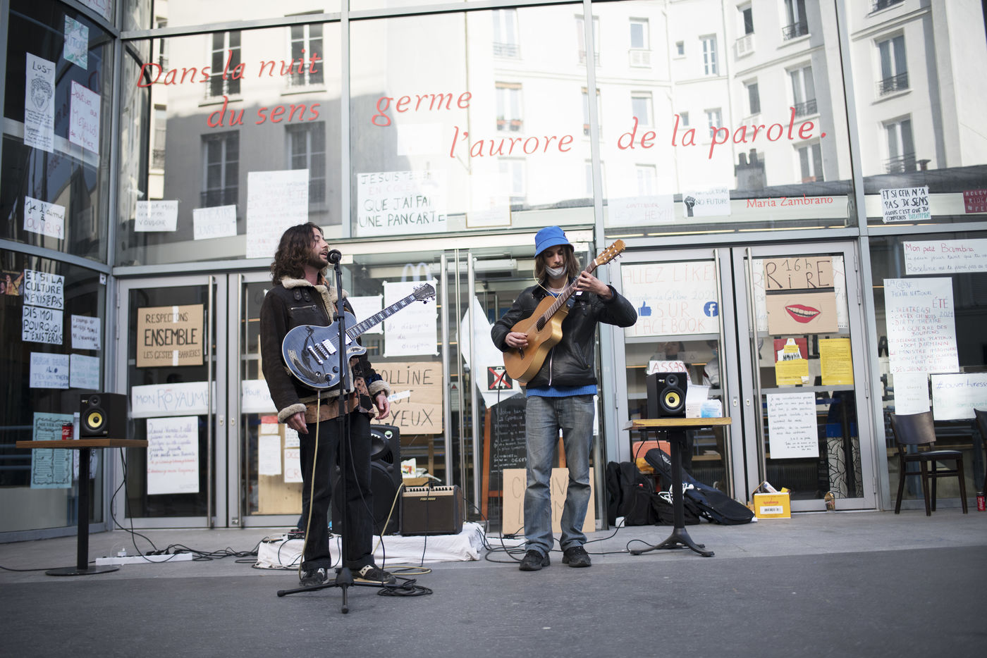 Depuis le 9 mars 2021, le théâtre national de la Colline est occupé par une trentaine d'étudiants en art dramatique demandant la réouverture des lieux culturels. Ce dimanche 4 avril avaient lieu plusieurs concerts et spectacles devant le théâtre occupé.