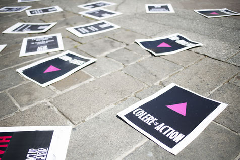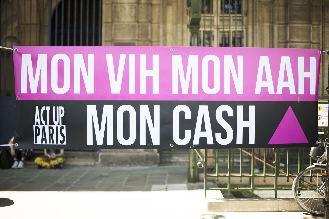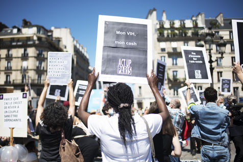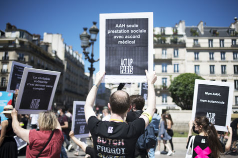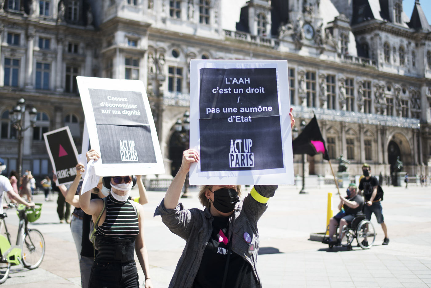 Gathering initiated by Act Up-Paris on the Place de l'Hôtel de Ville to demand that the calculation of the AAH Allocation Adulte Handicapée is no longer subject to the income of the partners of the persons concerned, on June 13, 2021, in Paris.