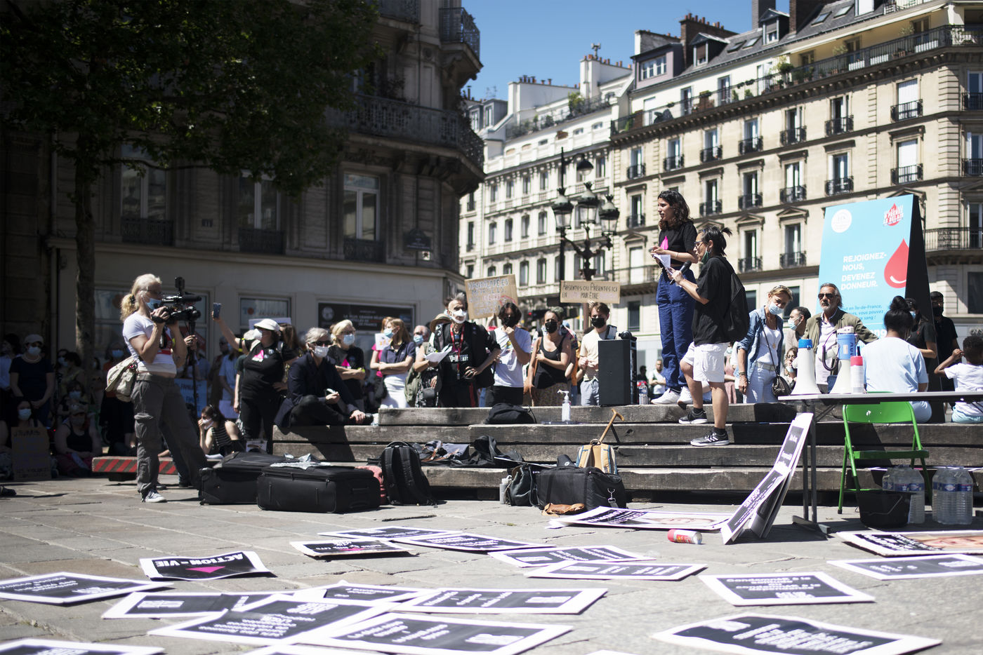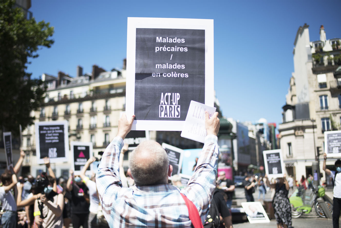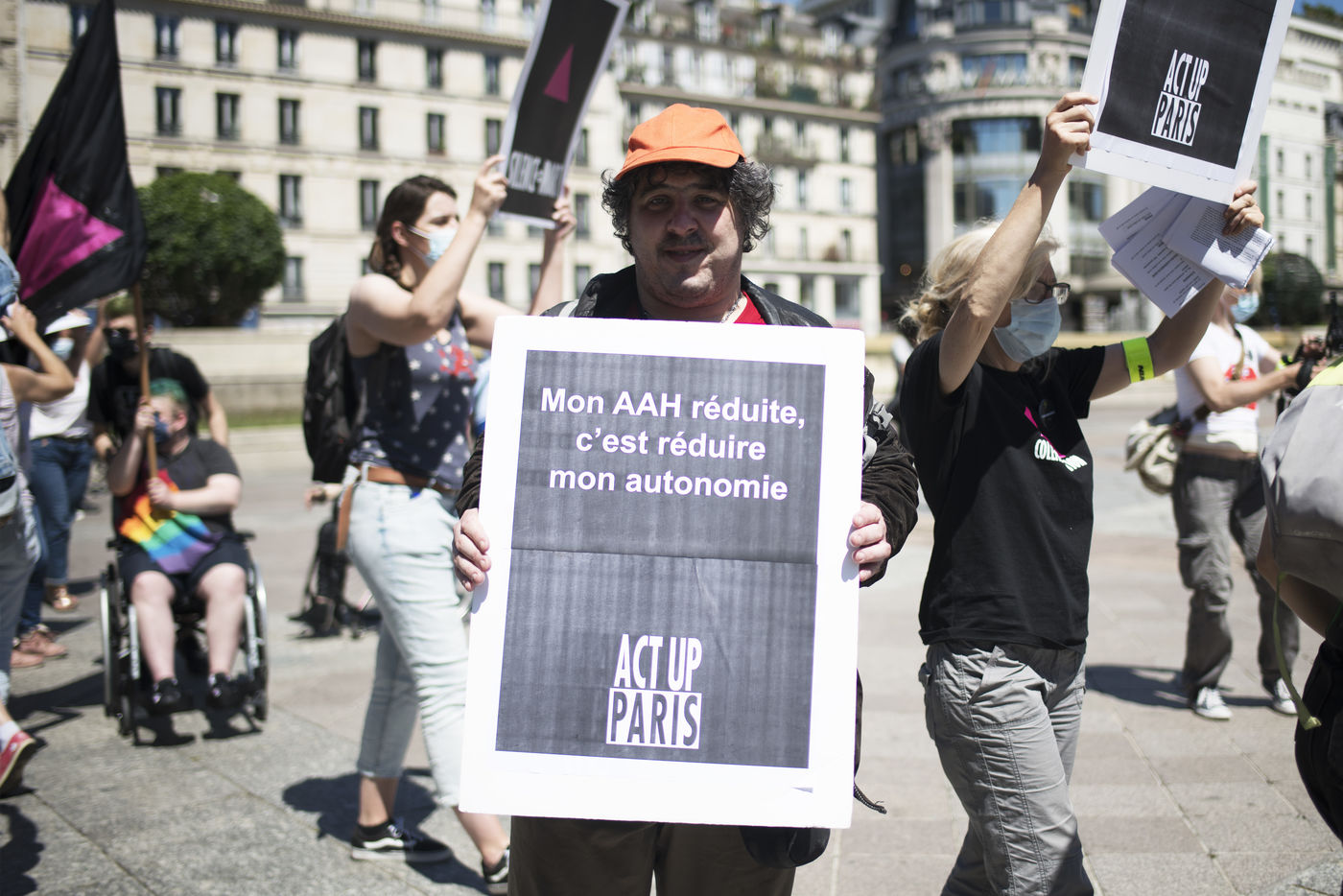 Rassemblement initié par Act Up-Paris sur la place de l'Hôtel de Ville pour demander que le calcul de l'AAH Allocation aux Adultes Handicapés ne soit plus assujetti au revenu des partenaires des personnes concernées, le 13 juin 2021, à Paris.