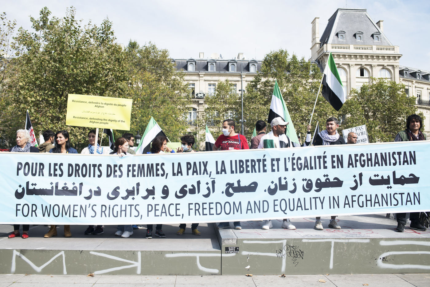 Manifestation en soutien aux femmes afghanes entre la place de la République et Hôtel de ville, le 19 septembre 2021, à Paris. Les manifestants marchaient pour les droits des femmes, la paix, la liberté et l'égalité en Afghanistan, et affirmaient leur soutien à la résistance face aux talibans.