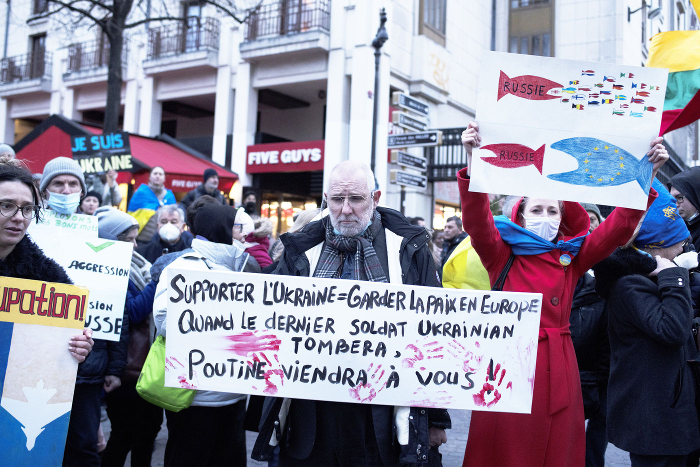 Manifestation en soutien au peuple ukrainien et contre la guerre en Ukraine, à Paris, le 19 février 2022 alors que soixante pour-cents des effectifs de l'armée russe sont déjà positionnés autour de l'Ukraine.