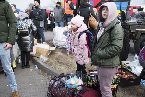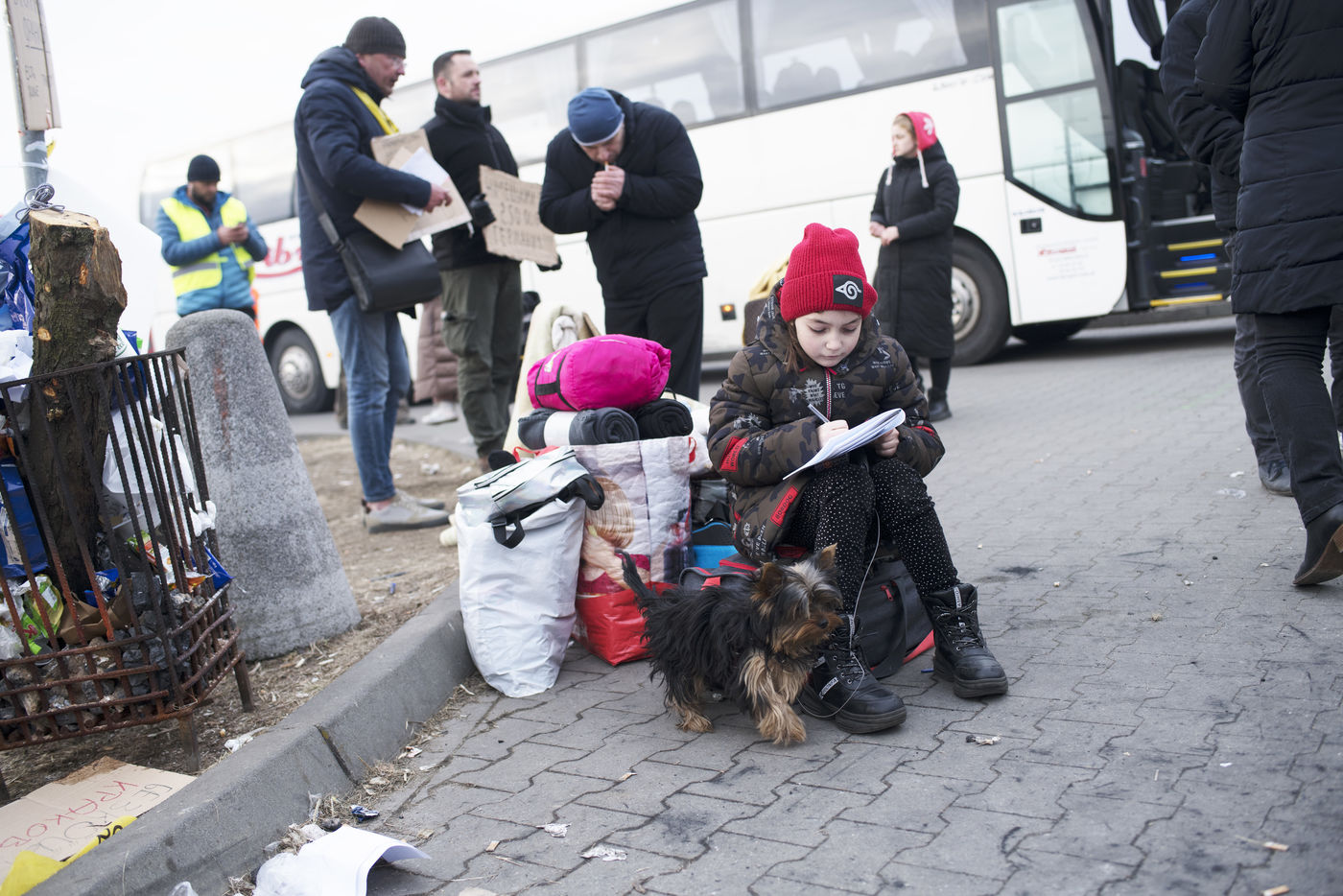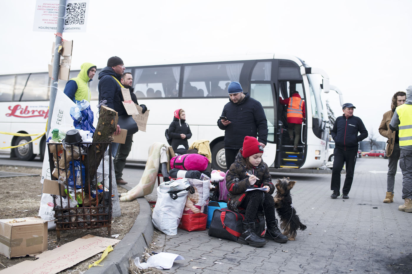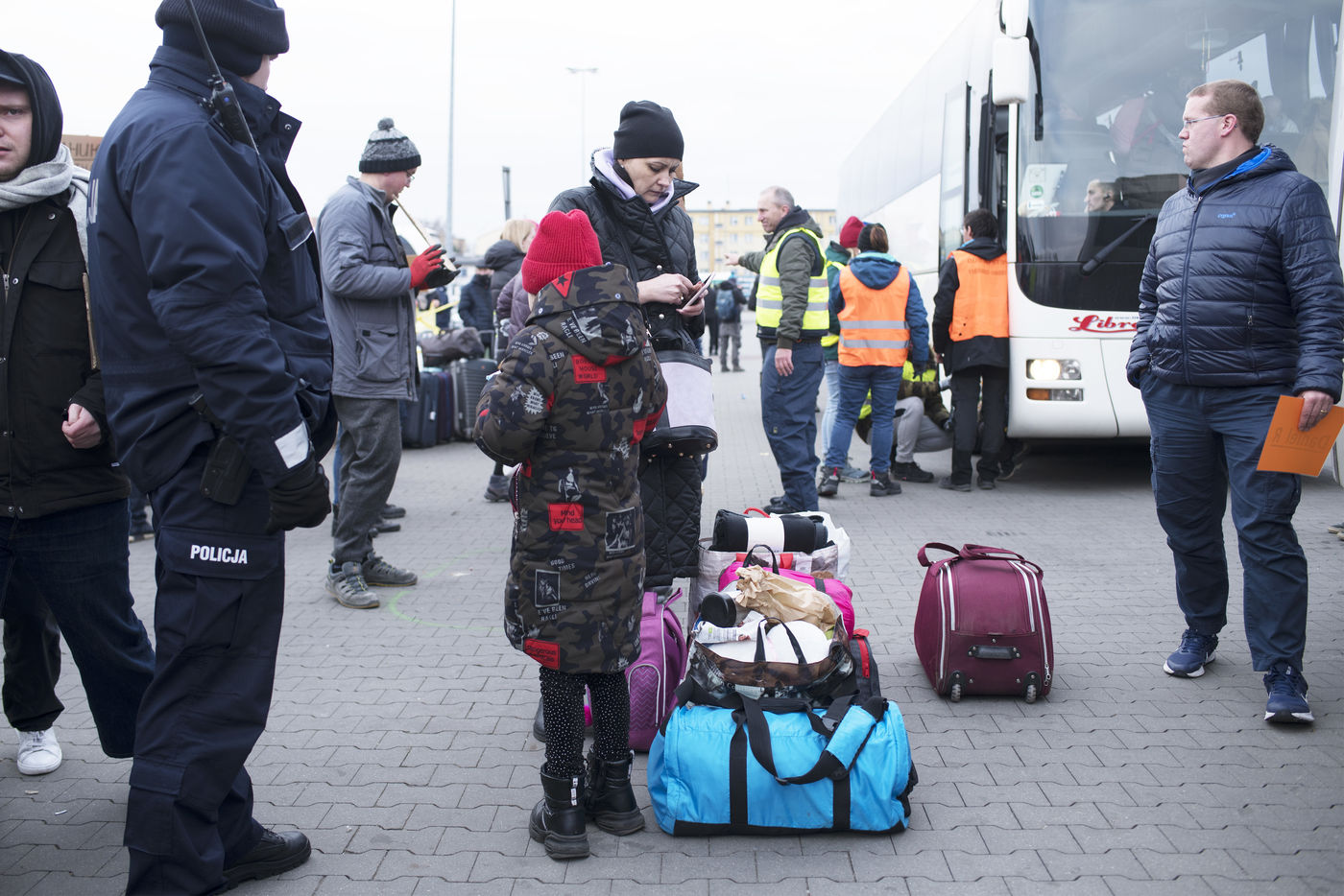 Ukrainian refugees are waiting for transport to leave Przemysl shortly after crossing the border between Ukraine and Poland. Several associations are present to help them. March 2nd 2022.