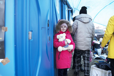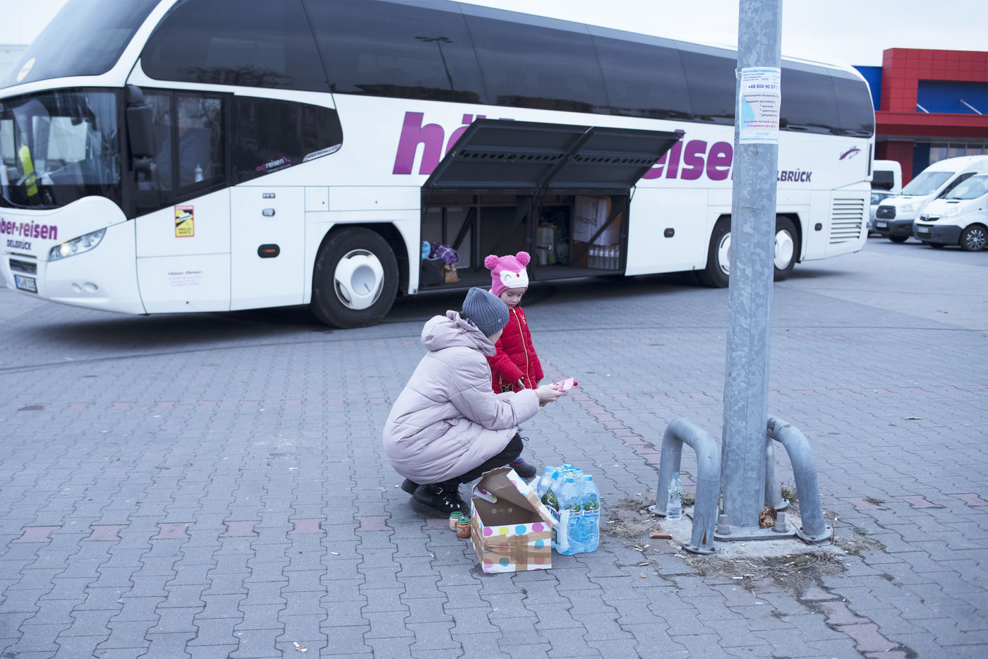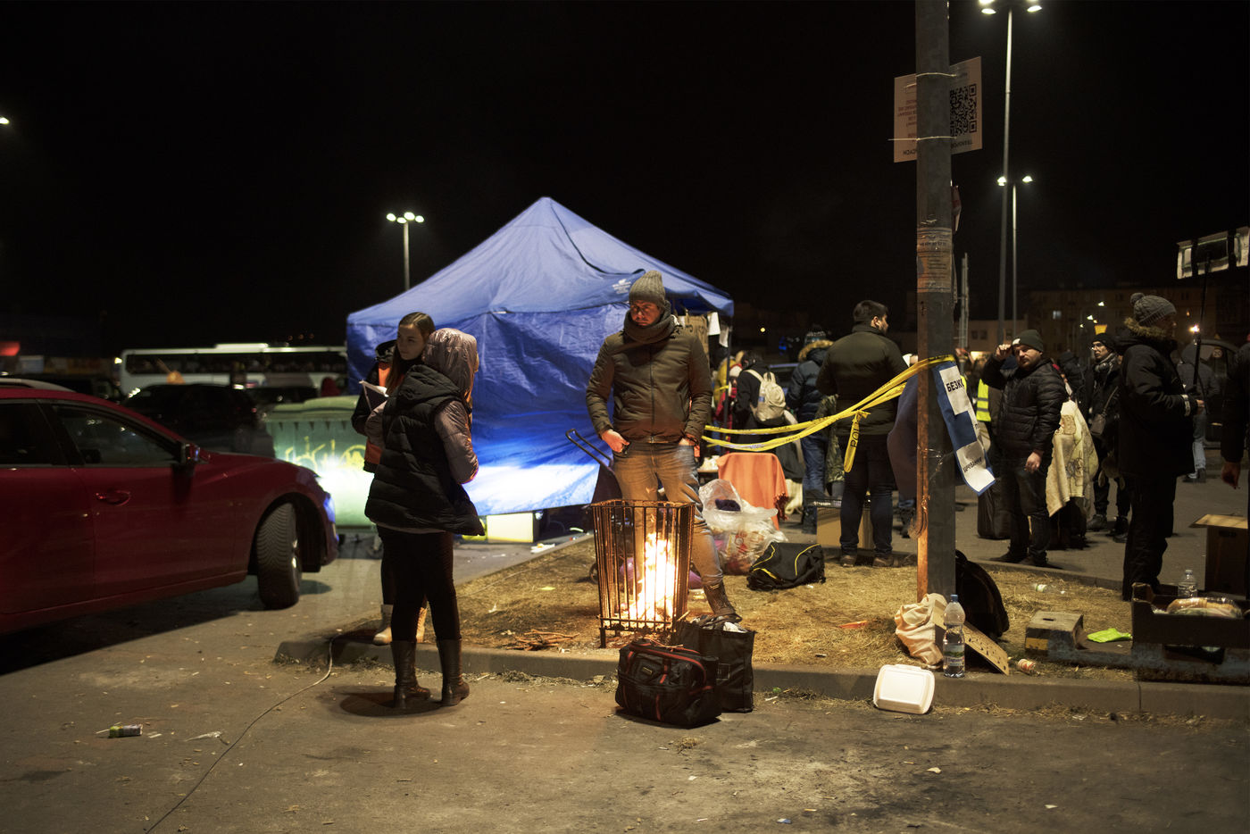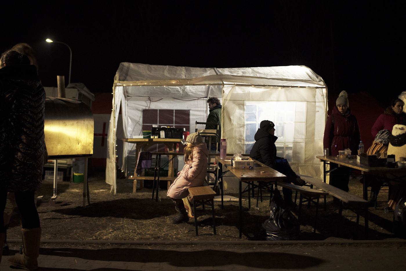 Ukrainian refugees are waiting for transport to leave Przemysl shortly after crossing the border between Ukraine and Poland. Several associations are present to help them. March 2nd 2022.