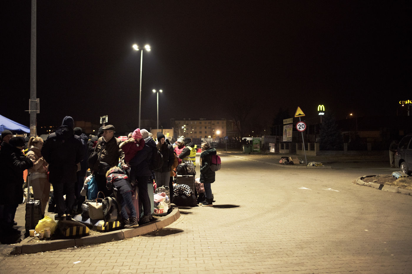 Des réfugiés ukrainiens attendent des moyens de transports pour quitter Przemysl peu de temps après avoir passé le frontière entre l'Ukraine et la Pologne. Plusieurs associations sont présentes pour leurs venir en aide. Le 2 Mars 2022.