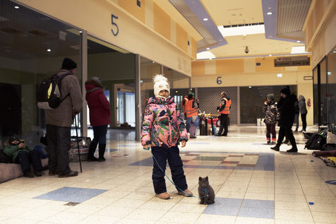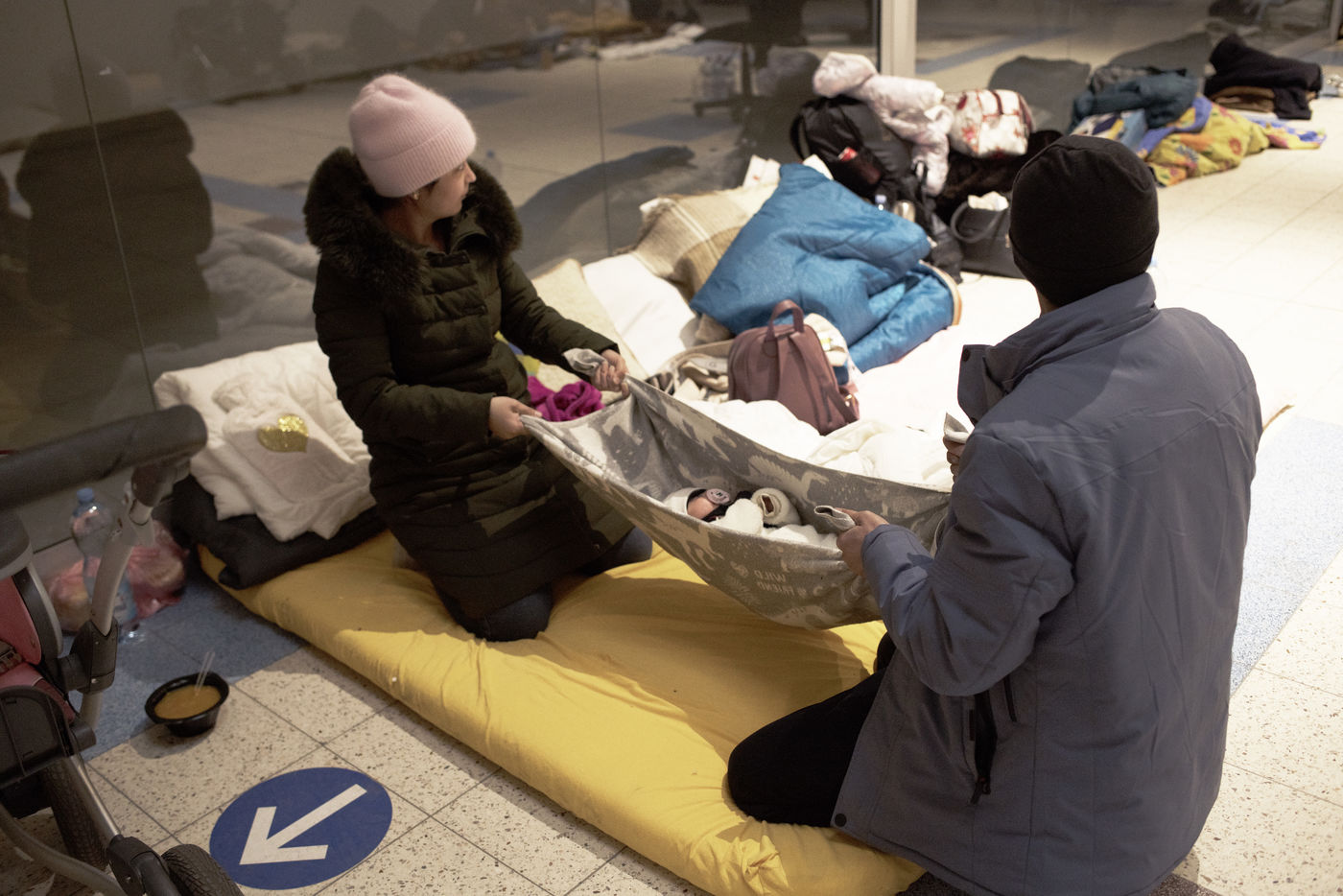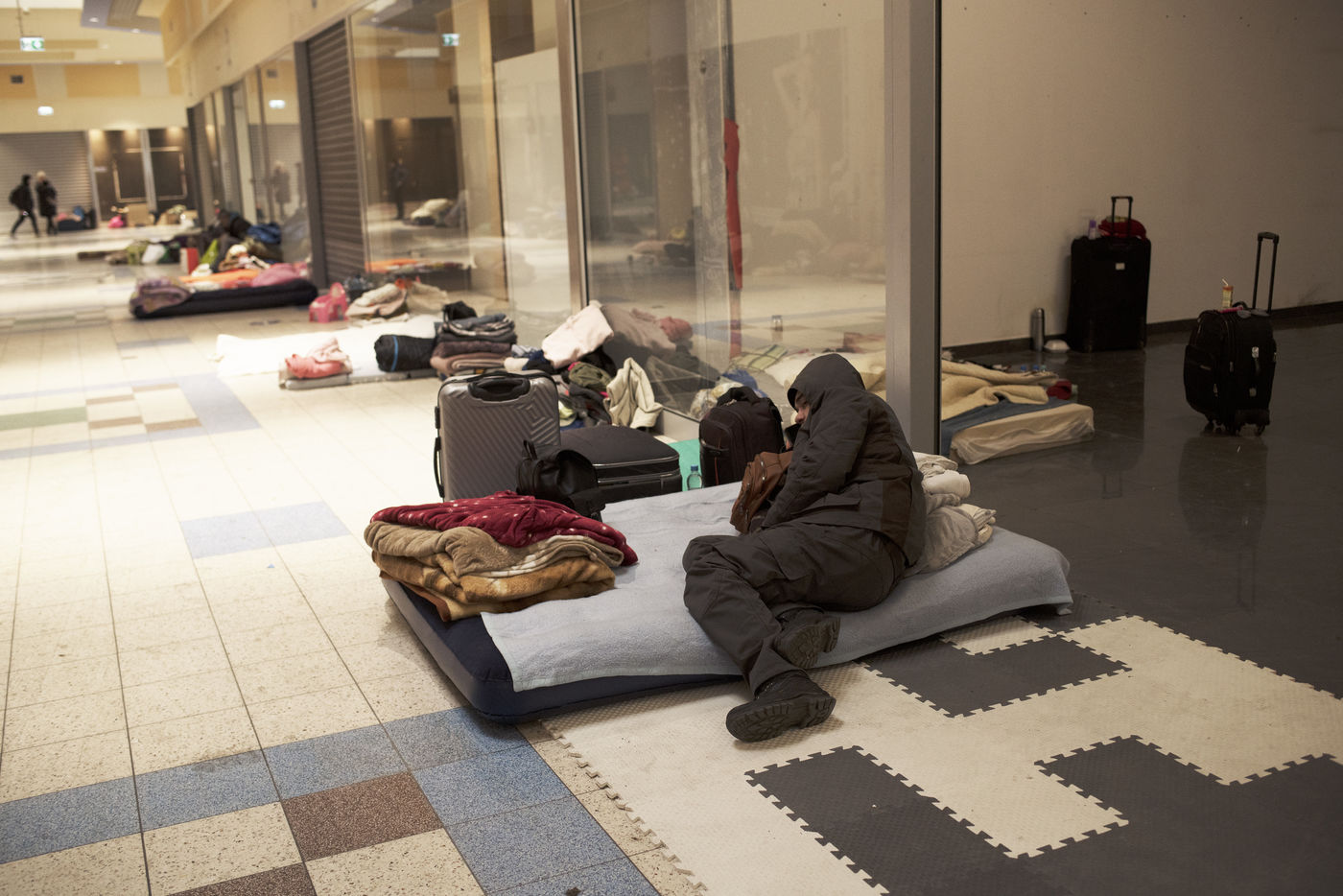 Ukrainian refugees wait for transport to leave Przemysl shortly after crossing the border between Ukraine and Poland. A shopping centre serves as a back-up accommodation for those who have to wait for sometimes several days. March 2, 2022, in Przemysl, Poland.